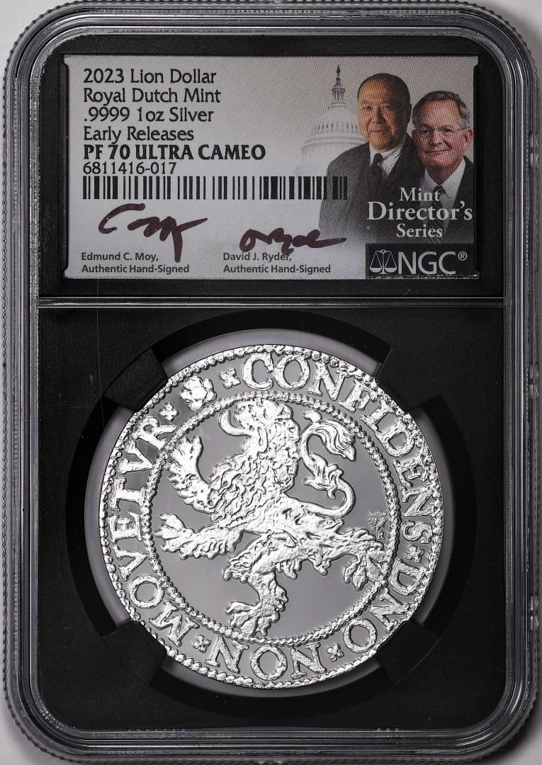 One 2023 Netherlands Proof Lion Dollar Silver Coin NGC PF70 Ultra Cameo Moy Signature. NGC Certified.
