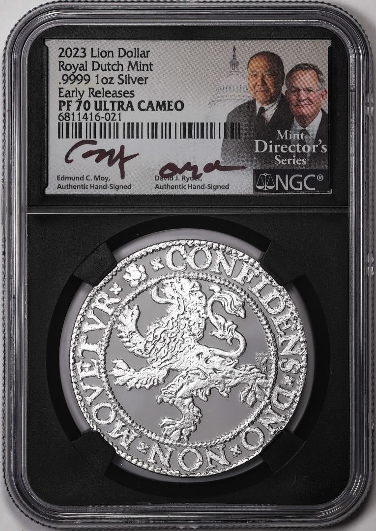One 2023 Netherlands Proof Lion Dollar Silver Coin NGC PF70 Ultra Cameo Moy Signature. NGC Certified.