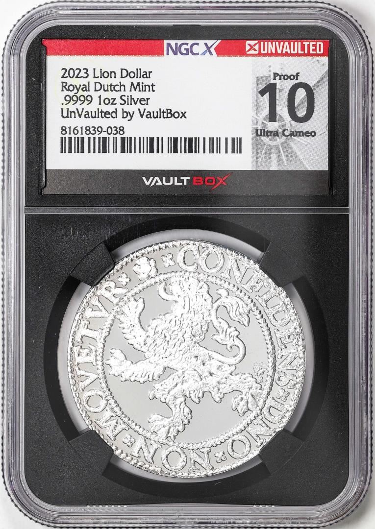 One 2023 Netherlands Proof Lion Dollar Silver Coin NGCX Proof 10 Ultra Cameo VaultBox. NGCX Certified.