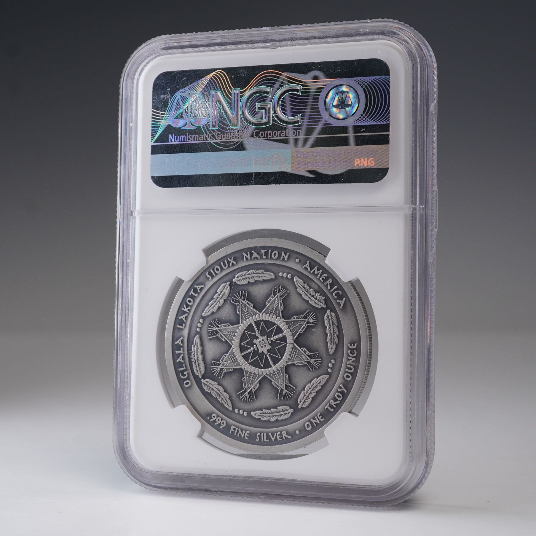 Struck in one troy ounce of .999 fine silver and bearing a face value of one dollar, this 2023 coin was issued by the Oglala Lakota Sioux Nation and showcases a striking ultra high relief (UHR) antiqued finish. Graded MS 70 by NGC and designated "First Day of Issue". The obverse features a commanding image of a bald eagle in flight with wings outstretched, rendered in exquisite detail and encircled by inscriptions reading AMERICAN BALD EAGLE, ONE DOLLAR 1 OZ. FINE SILVER, and the date 2023. The reverse presents a deeply textured emblem of the Oglala Lakota Sioux Nation, composed of an eight-pointed star design interwoven with feathers and beadwork, symbolizing cultural identity and spiritual heritage. Housed in a graded NGC holder for further preservation and authentication. Slab measures: 2.25"L x 0.25"W x 3.25"H. Coin diameter: 38.1 mm.