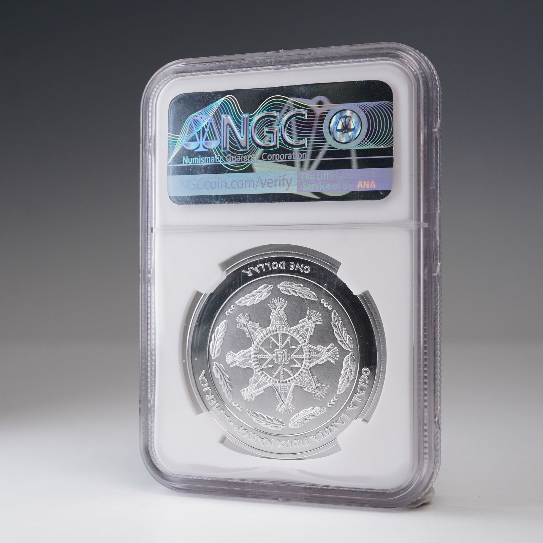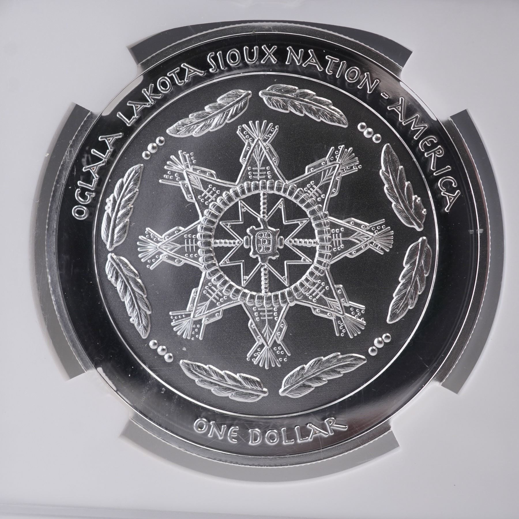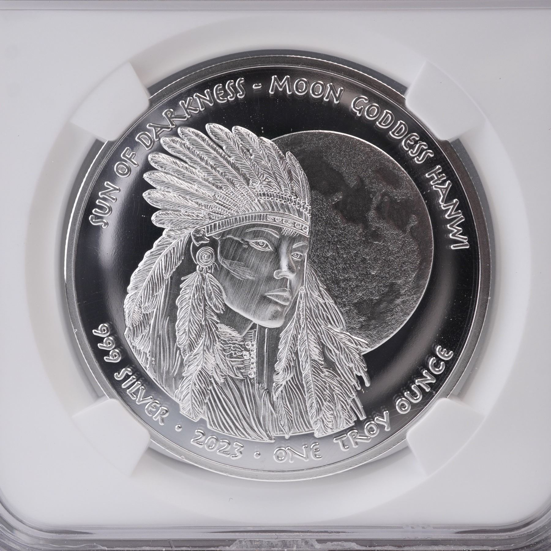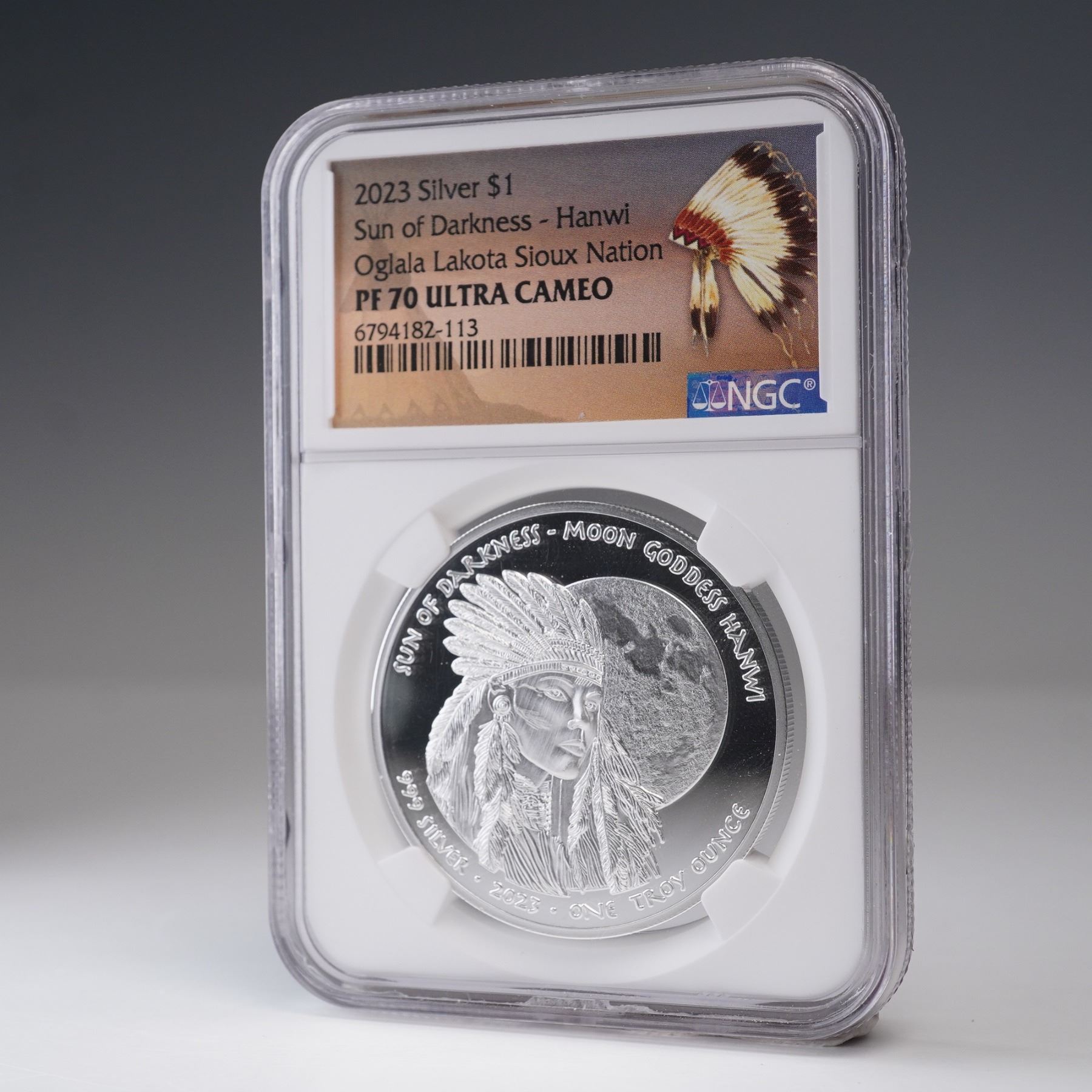 A 2023 one dollar silver coin issued under the authority of the Oglala Lakota Sioux Nation, struck in one troy ounce of .999 fine silver and certified by NGC as PF 70 Ultra Cameo. The obverse features a meticulously rendered depiction of Hanwi, the Sun of Darkness in Lakota tradition, adorned with a feathered war bonnet, positioned before a full lunar disc with the inscription "SUN OF DARKNESS- MOON GODDESS HANWII" arching above. he reverse bears the ceremonial emblem of the Oglala Lakota Sioux Nation encircled by eight eagle feathers, with legends denoting the sovereign nation and denomination. Housed in a graded NGC holder for further preservation and authentication. Slab measures: 2.25"L x 0.25"W x 3.25"H. Coin diameter: 38.1 mm.