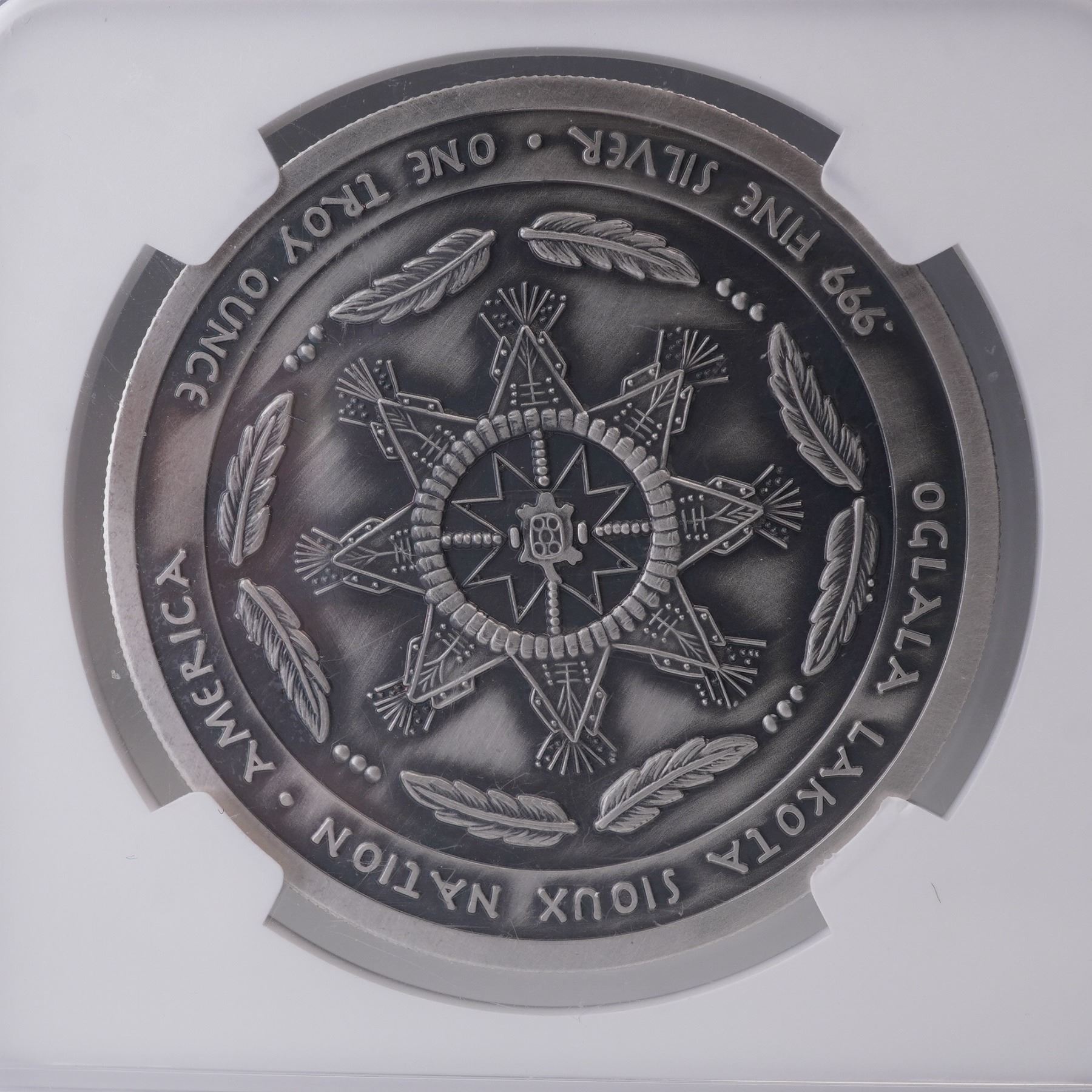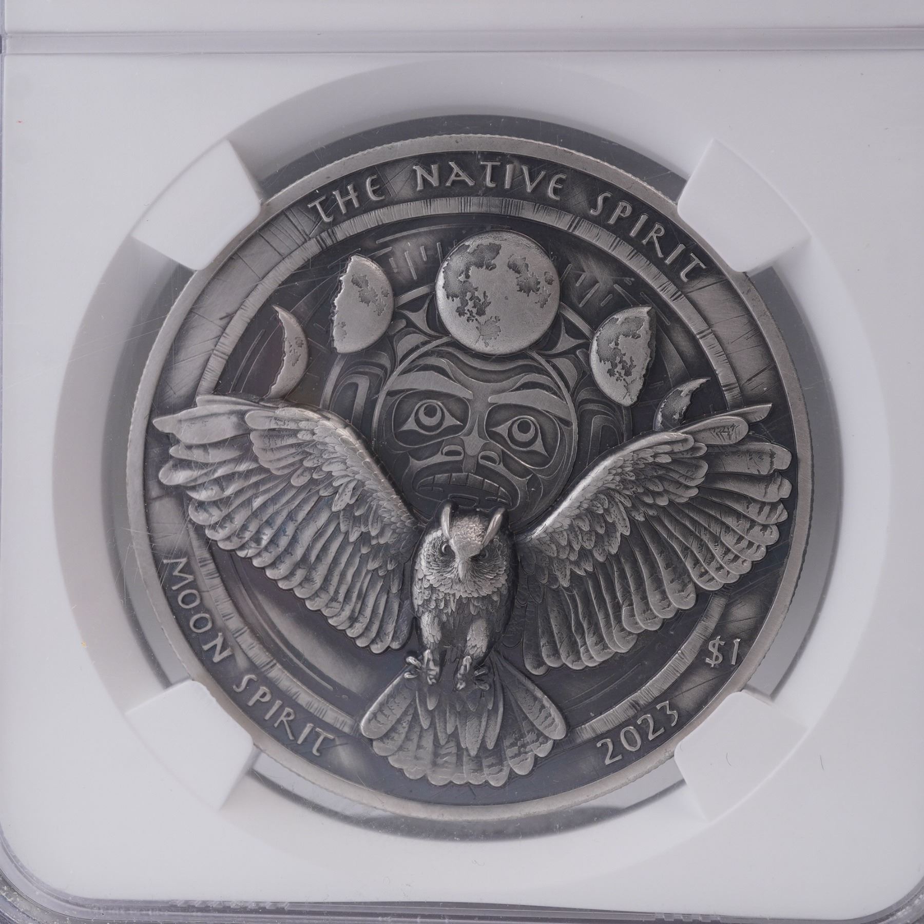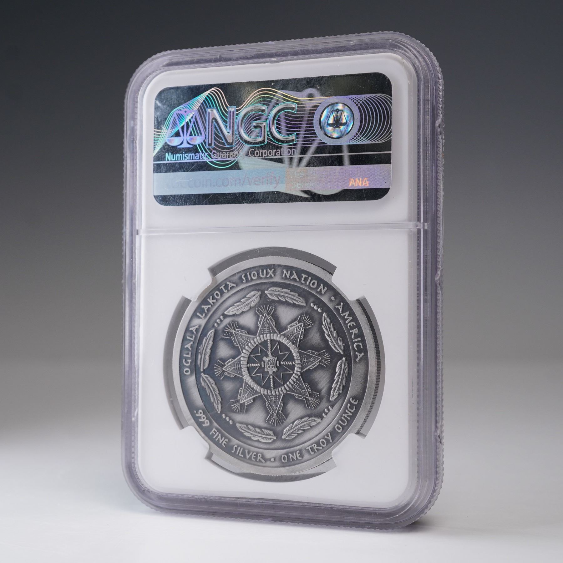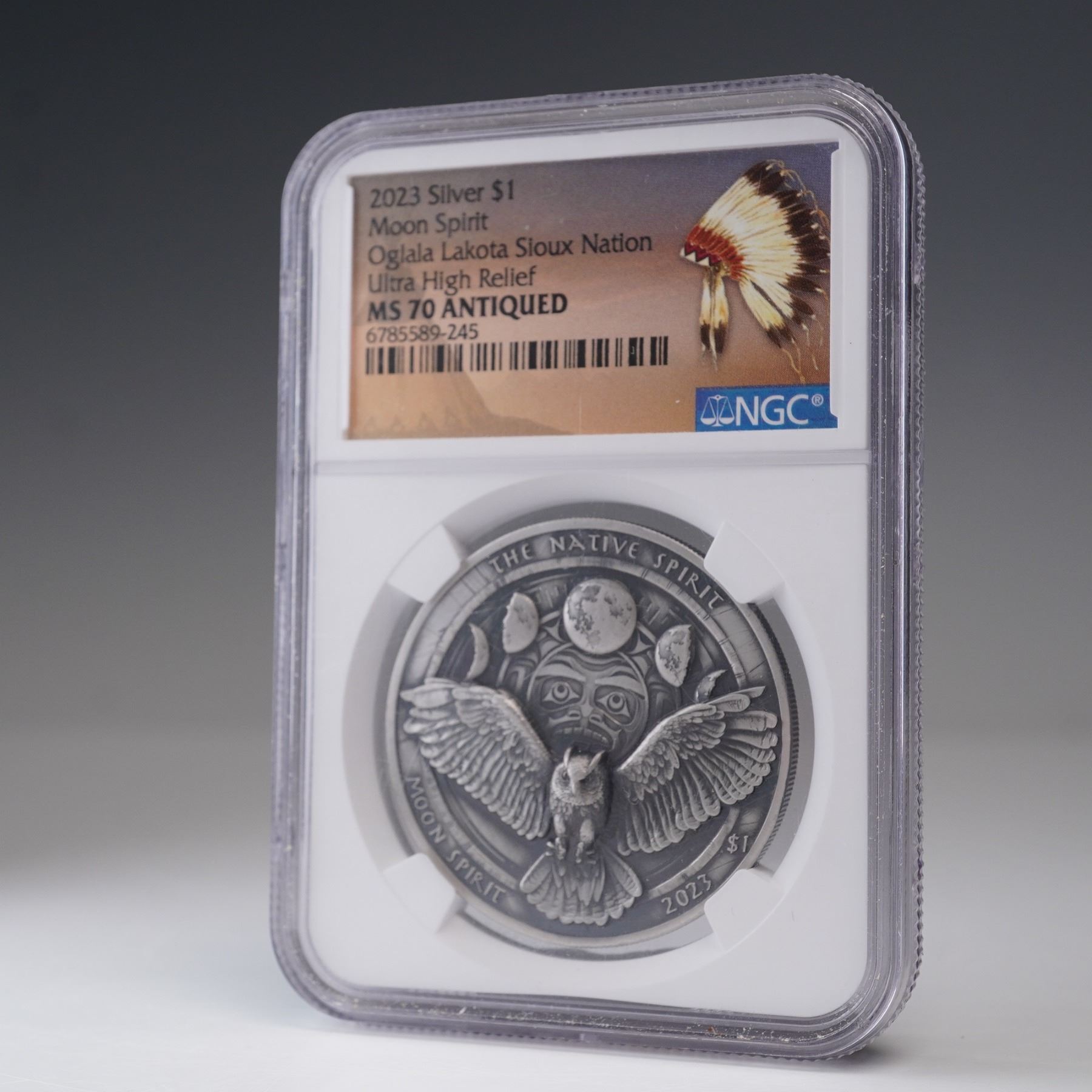 A 2023 one dollar silver commemorative coin issued by the Oglala Lakota Sioux Nation, struck in one troy ounce of .999 fine silver in ultra high relief with an antiqued finish and graded MS 70 by NGC. The obverse features a dynamic and symbolic depiction of a wide-winged owl in flight, emerging from the foreground of a stylized lunar mask framed by a sequence of moon phases. The artwork is crowned by the inscription "THE NATIVE SPIRIT" and ringed by text reading "MOON SPIRIT," the date of issue, and denomination. The reverse bears the emblematic seal of the Oglala Lakota Sioux Nation, composed of a central eight-pointed star surrounded by traditional feather and beadwork motifs, with legends denoting national authority and silver purity. Rendered with exceptional sculptural depth. Housed in a graded NGC holder for further preservation and authentication. Slab measures: 2.25"L x 0.25"W x 3.25"H. Coin diameter: 38.1 mm.
