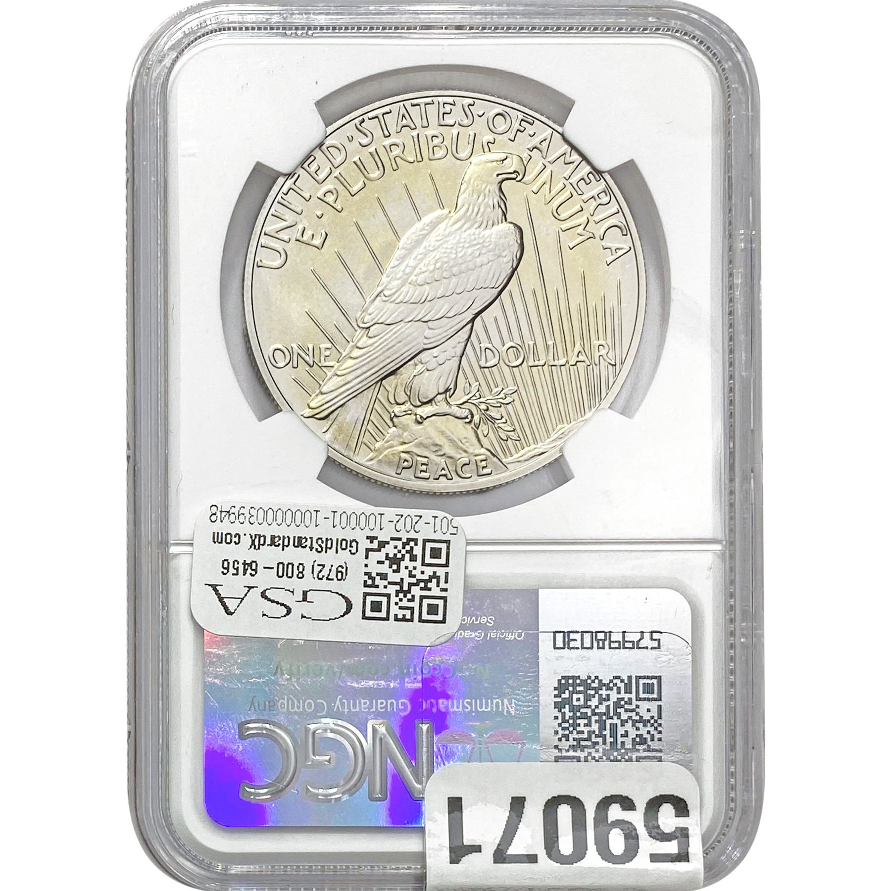 e. Coins sold referencing a third-party grading service are sold “AS IS” without any express or implied warranty, except for a guarantee by GSA that they are genuine. Removal or alteration of the holder, voids all of Bidder’s claims concerning that Product. Certain warranties may be available from the grading services and Bidders are referred to them for further details: Numismatic Guaranty Corporation (NGC), PO Box 4776, Sarasota, FL 34230, www.ngccoin.com/services/writtenguarantee.asp; Professional Coin Grading Services (PCGS), PO Box 9458, Newport Beach, CA 92658, www.pcgs.com/guarantee.html; ANACS, 6555 S. Kenton St., Ste. 303, Englewood, CO 80111; and Independent Coin Grading Co. (ICG), 7901 East Bellview, Ave., Suite 50, Englewood, CO 80111.