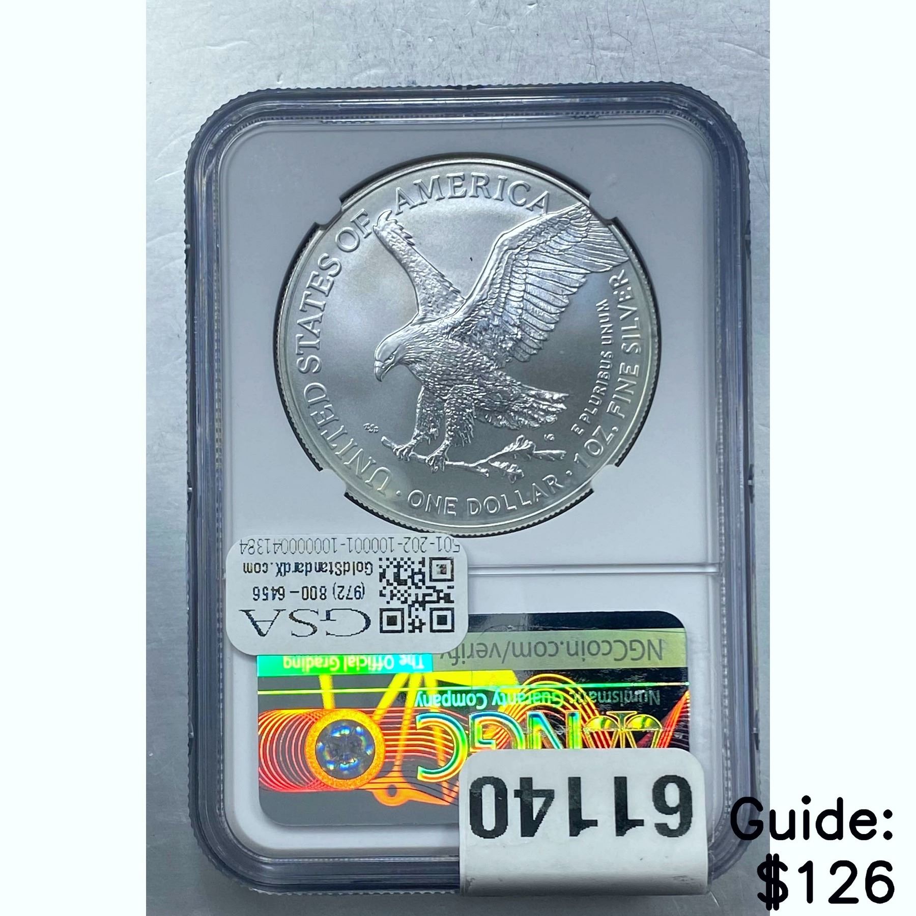 e. Coins sold referencing a third-party grading service are sold “AS IS” without any express or implied warranty, except for a guarantee by GSA that they are genuine. Removal or alteration of the holder, voids all of Bidder’s claims concerning that Product. Certain warranties may be available from the grading services and Bidders are referred to them for further details: Numismatic Guaranty Corporation (NGC), PO Box 4776, Sarasota, FL 34230, www.ngccoin.com/services/writtenguarantee.asp; Professional Coin Grading Services (PCGS), PO Box 9458, Newport Beach, CA 92658, www.pcgs.com/guarantee.html; ANACS, 6555 S. Kenton St., Ste. 303, Englewood, CO 80111; and Independent Coin Grading Co. (ICG), 7901 East Bellview, Ave., Suite 50, Englewood, CO 80111.