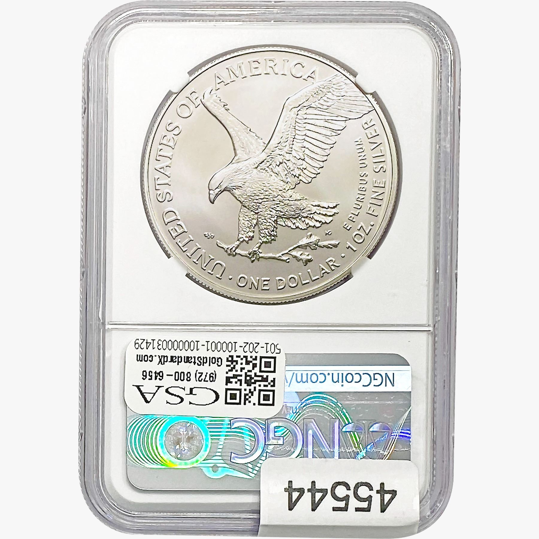 e. Coins sold referencing a third-party grading service are sold “AS IS” without any express or implied warranty, except for a guarantee by GSA that they are genuine. Removal or alteration of the holder, voids all of Bidder’s claims concerning that Product. Certain warranties may be available from the grading services and Bidders are referred to them for further details: Numismatic Guaranty Corporation (NGC), PO Box 4776, Sarasota, FL 34230, www.ngccoin.com/services/writtenguarantee.asp; Professional Coin Grading Services (PCGS), PO Box 9458, Newport Beach, CA 92658, www.pcgs.com/guarantee.html; ANACS, 6555 S. Kenton St., Ste. 303, Englewood, CO 80111; and Independent Coin Grading Co. (ICG), 7901 East Bellview, Ave., Suite 50, Englewood, CO 80111.