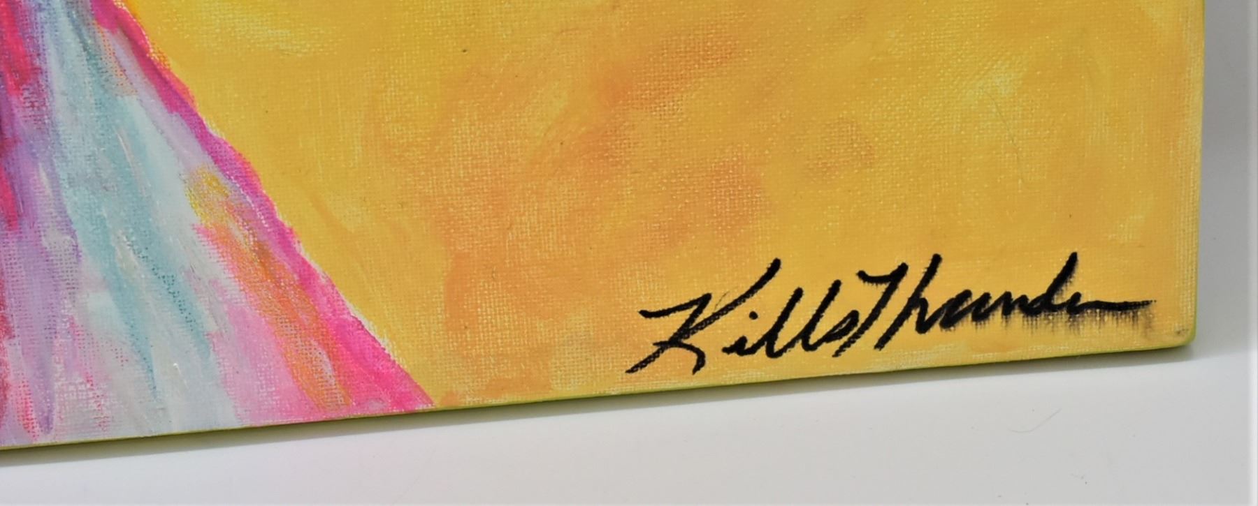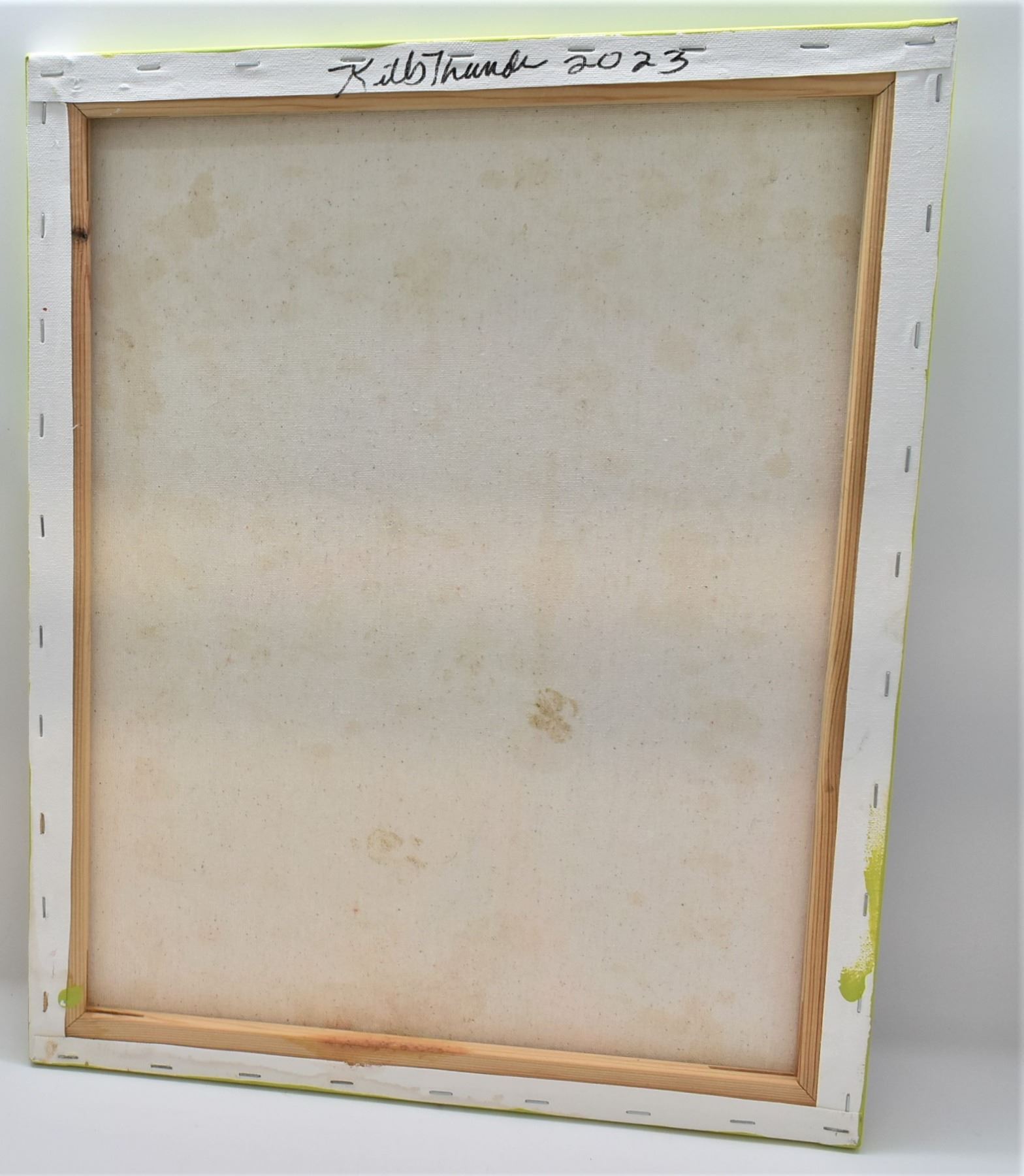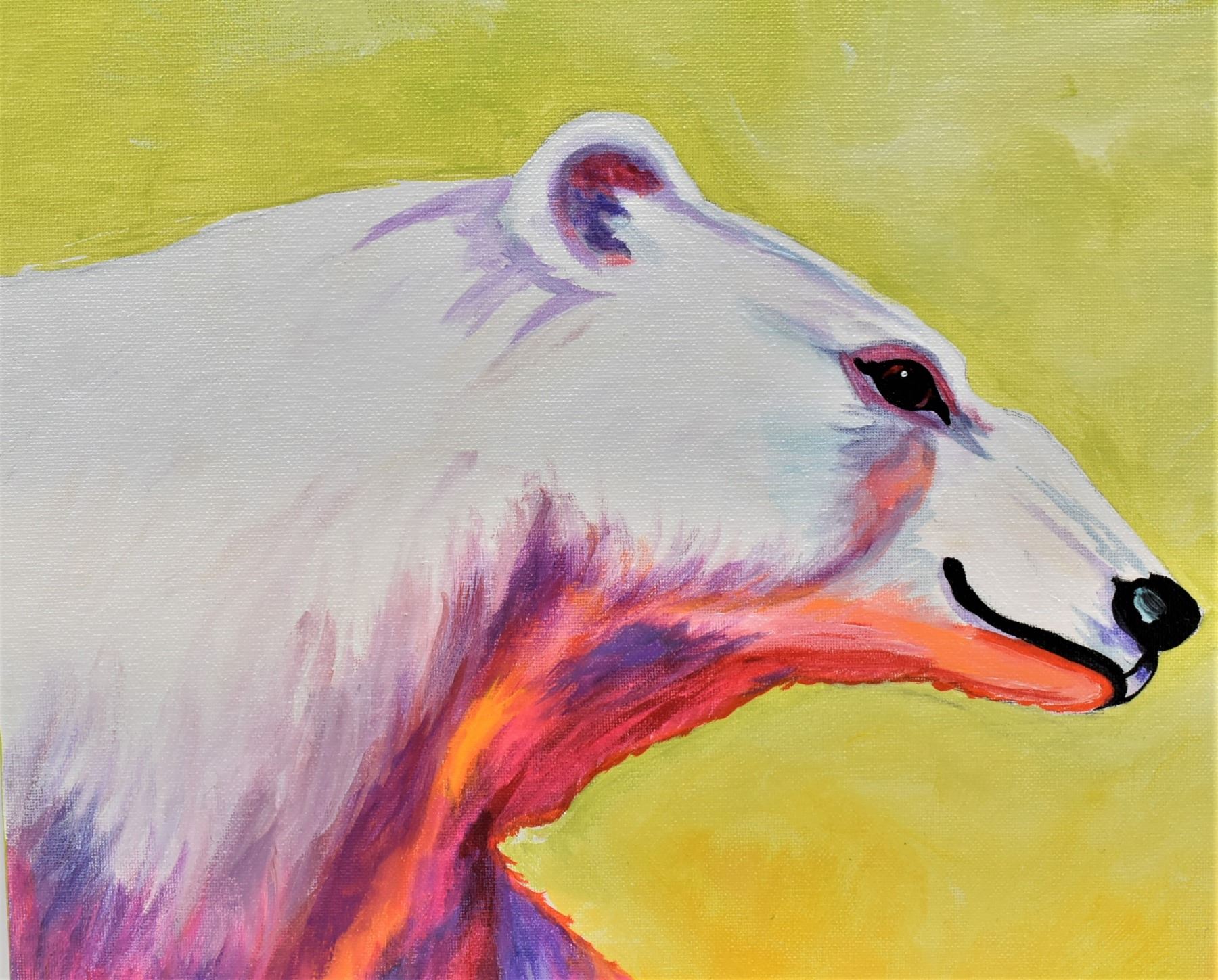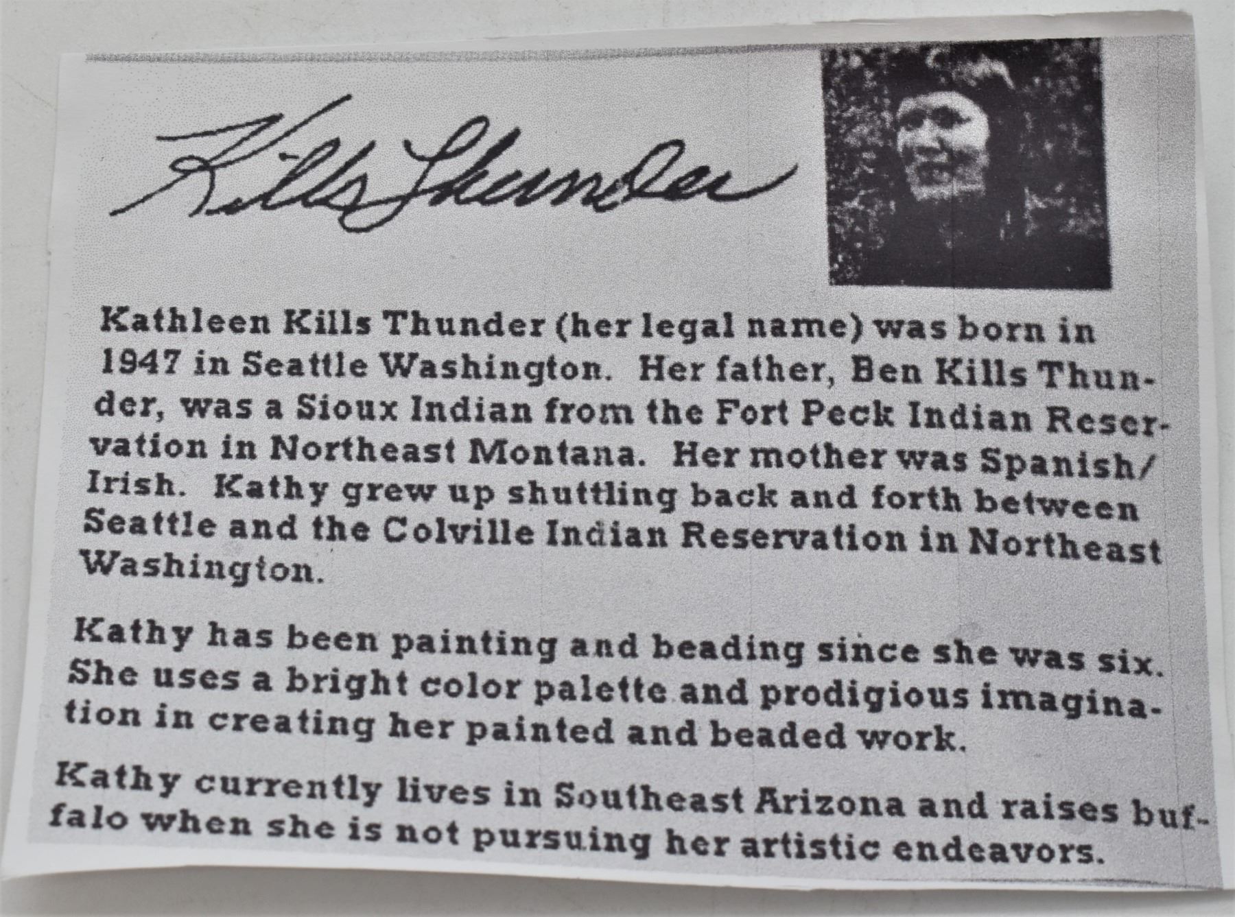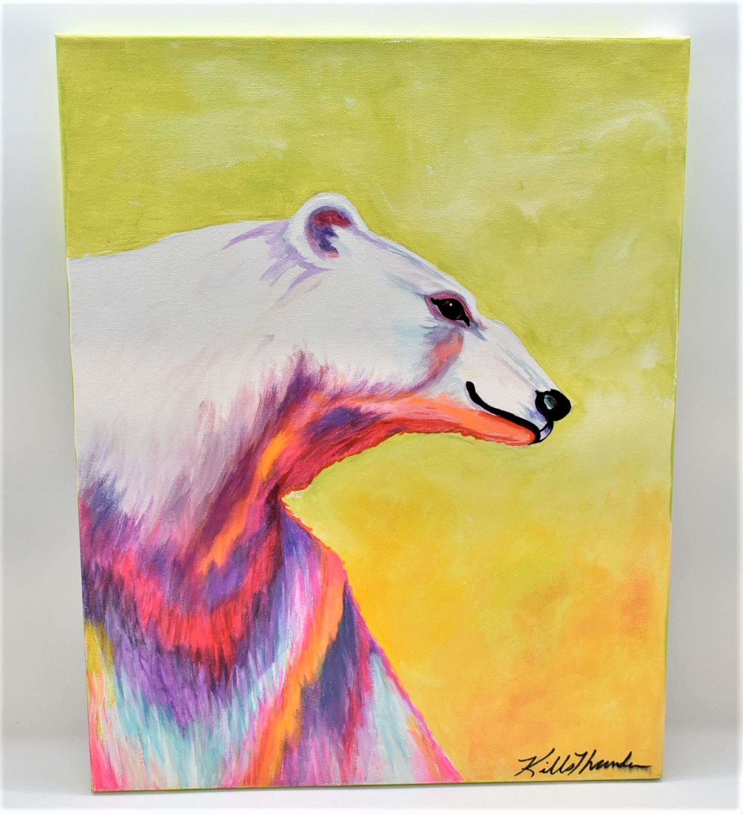 Original 2023 Native American Sioux Acrylic Painting ''Polar Beauty'' by Kills Thunder, measures 16'' x 20'' and is signed by the artist, Artist Bio: Kathleen Kills Thunder (her legal name) was born in 1947 in Seattle, WA. Her father, Ben Kills Thunder, was a Sioux Indian from the Fort Peck Indian Reservation in NE Montana and her mother was Spanish/Irish. Kathy has been painting and beading since she was six.