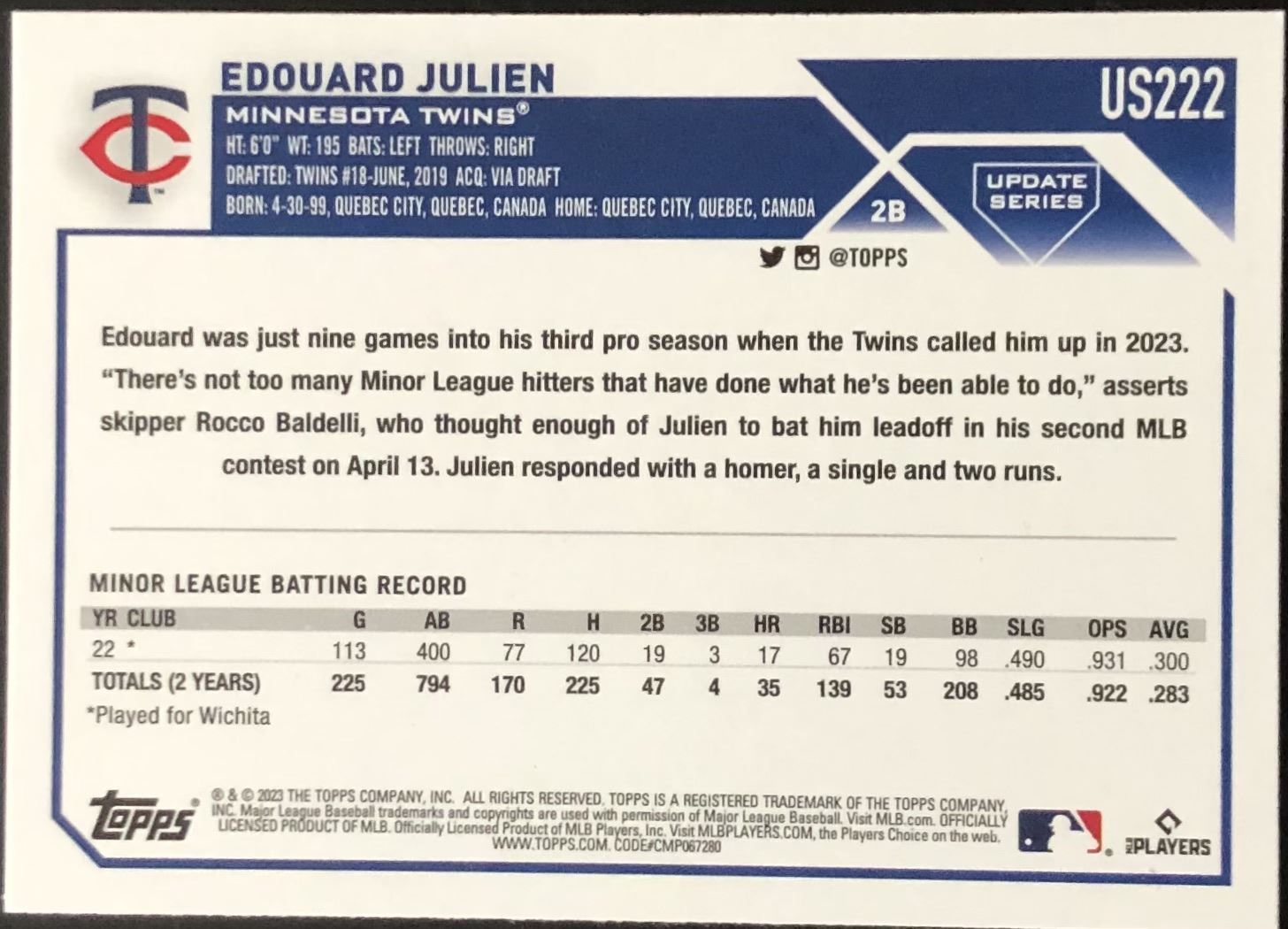 Card #US222 MLB, baseball, rookie