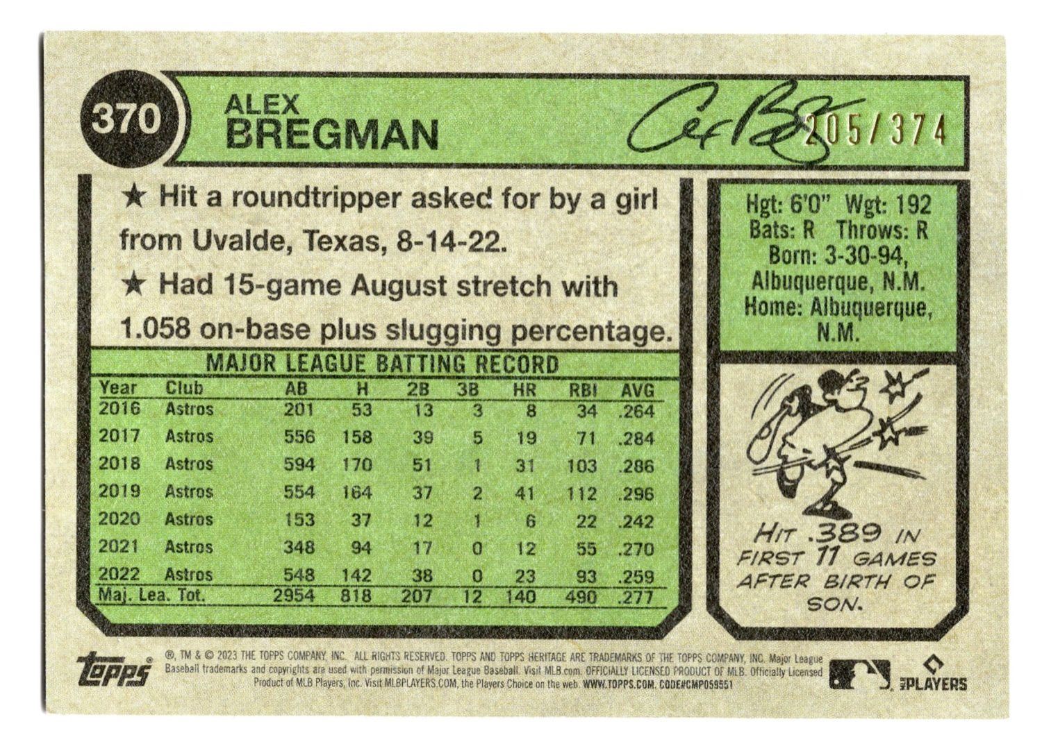 2023 Topps Heritage Silver Refractor Alex Bregman Card #370 - Numbered Card: #205/374