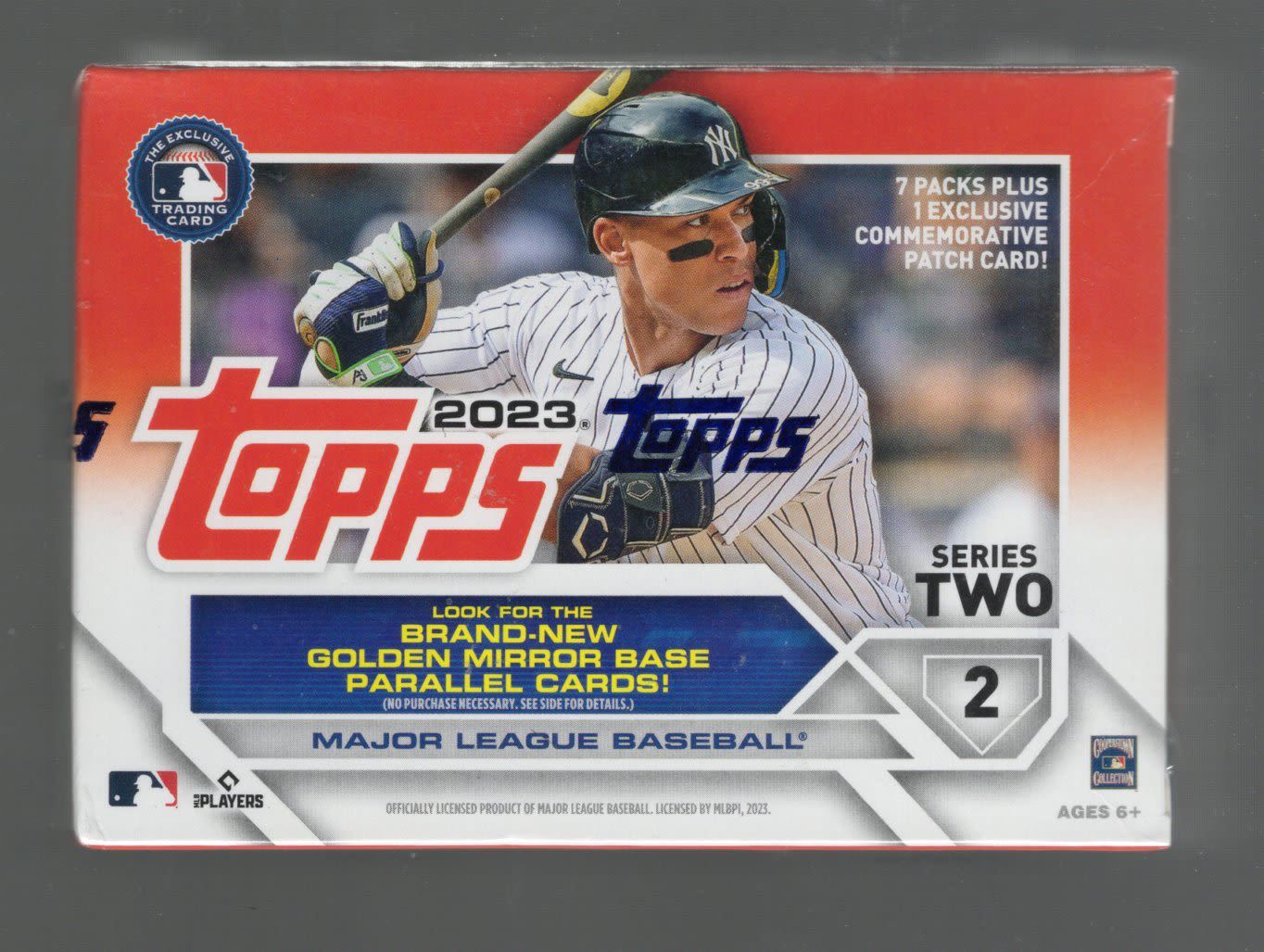 2023 Topps Series Two Blaster Box. 7 Packs plus 1 Commemorative Patch Card. Look for Golden Mirror B