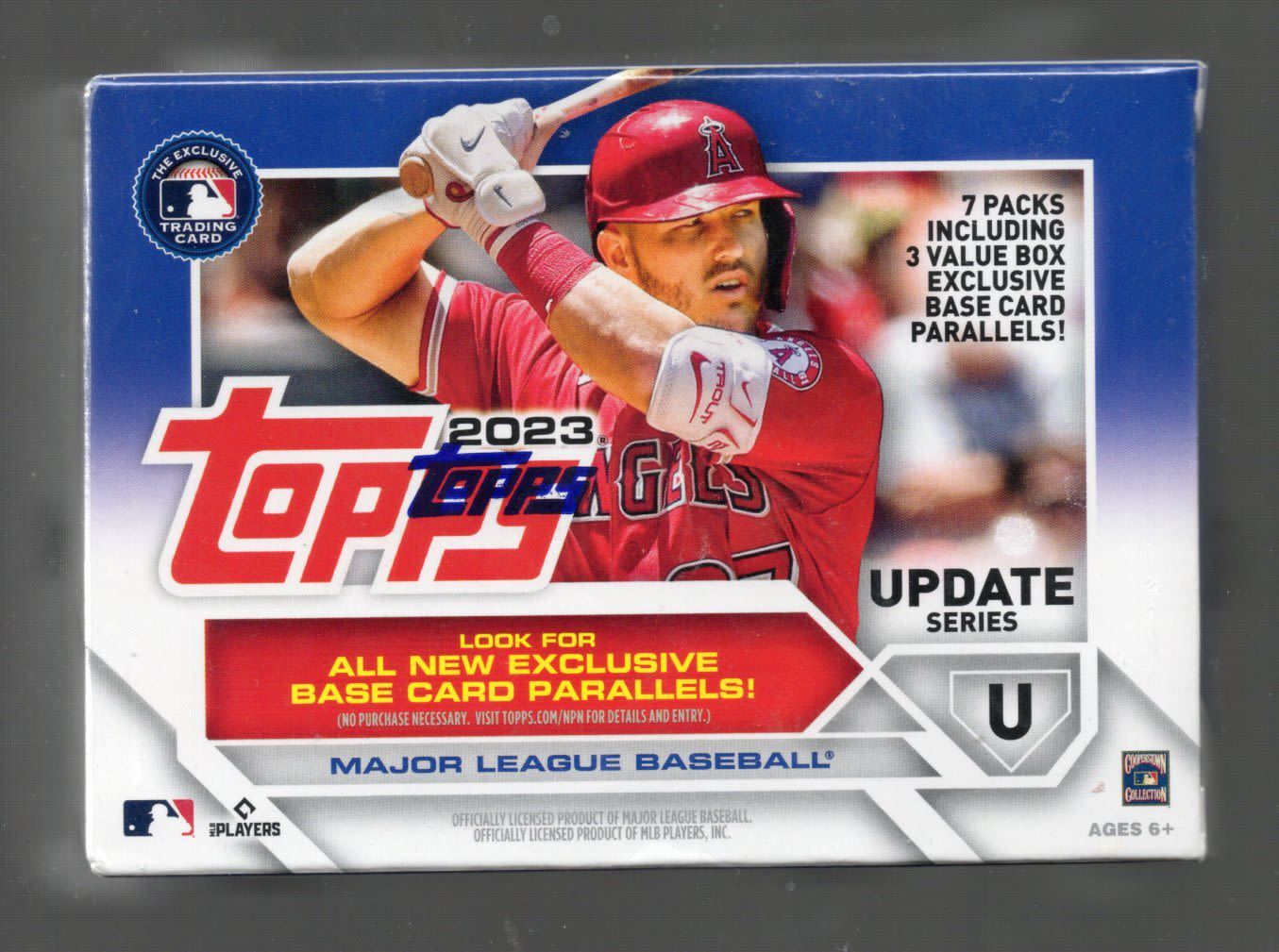 2023 Topps Update Series Baseball Blaster Box: Exclusive to this and all other value boxes - Guaranteed 3 All - New base card parallels. Look for autographs & relic cards. 12 Cards per pack and 7 packs per box. 87 Total cards per box including 3 Value box exclusive parallels.