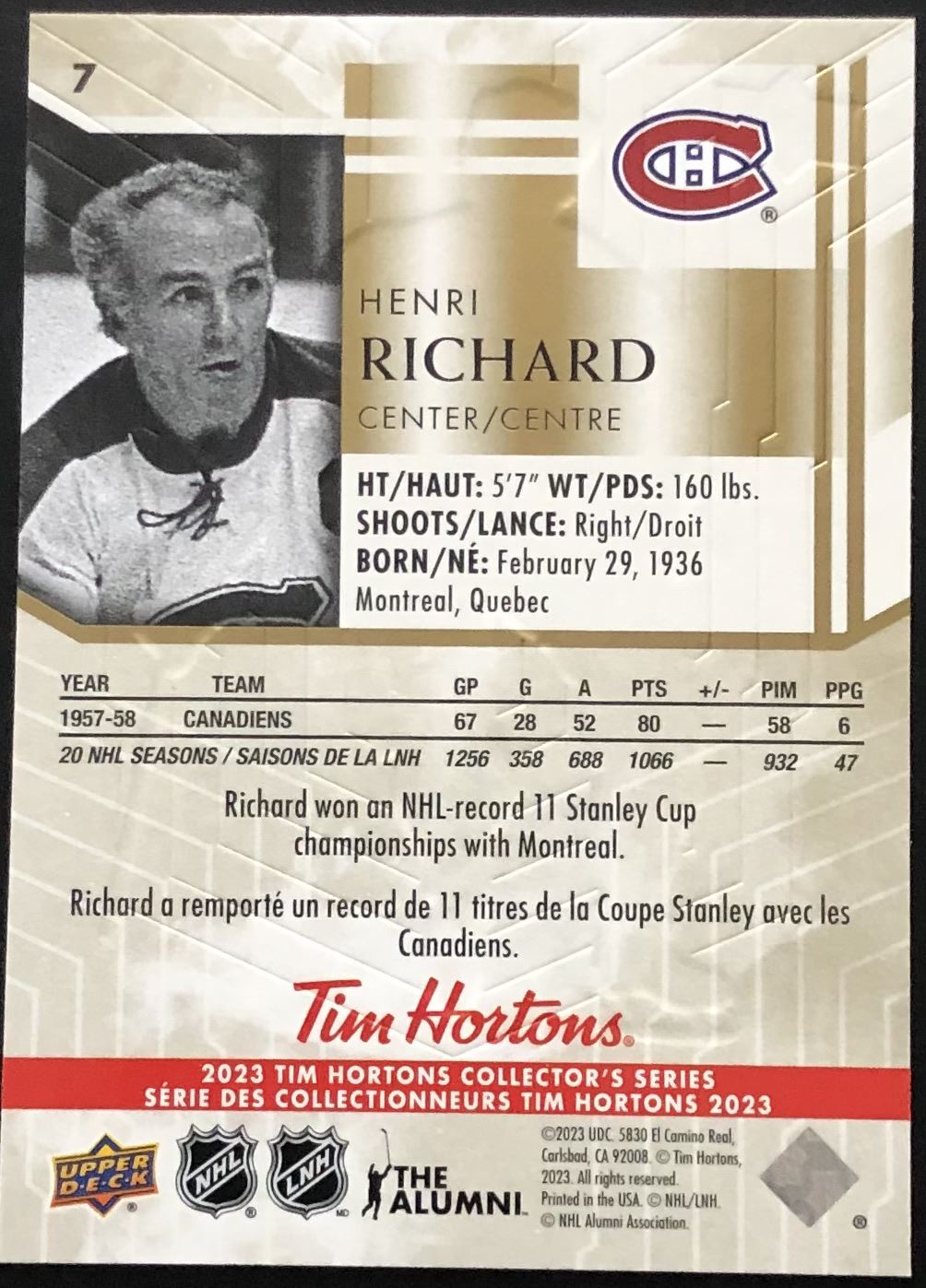 Tim Hortons card #7 UD, regional, NHL, hockey, hall of fame