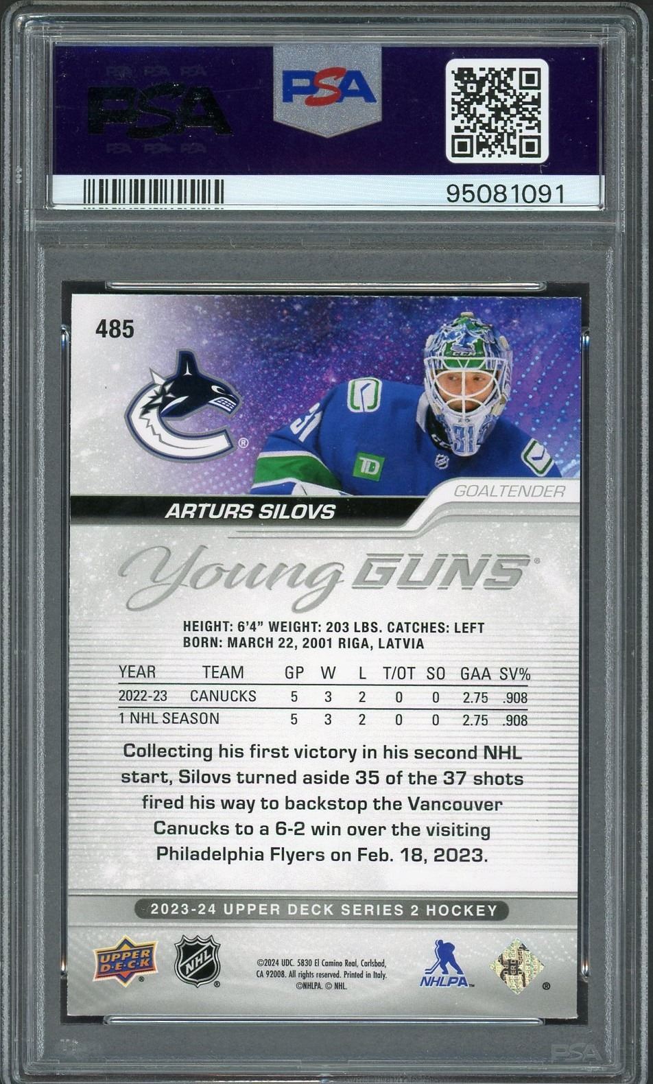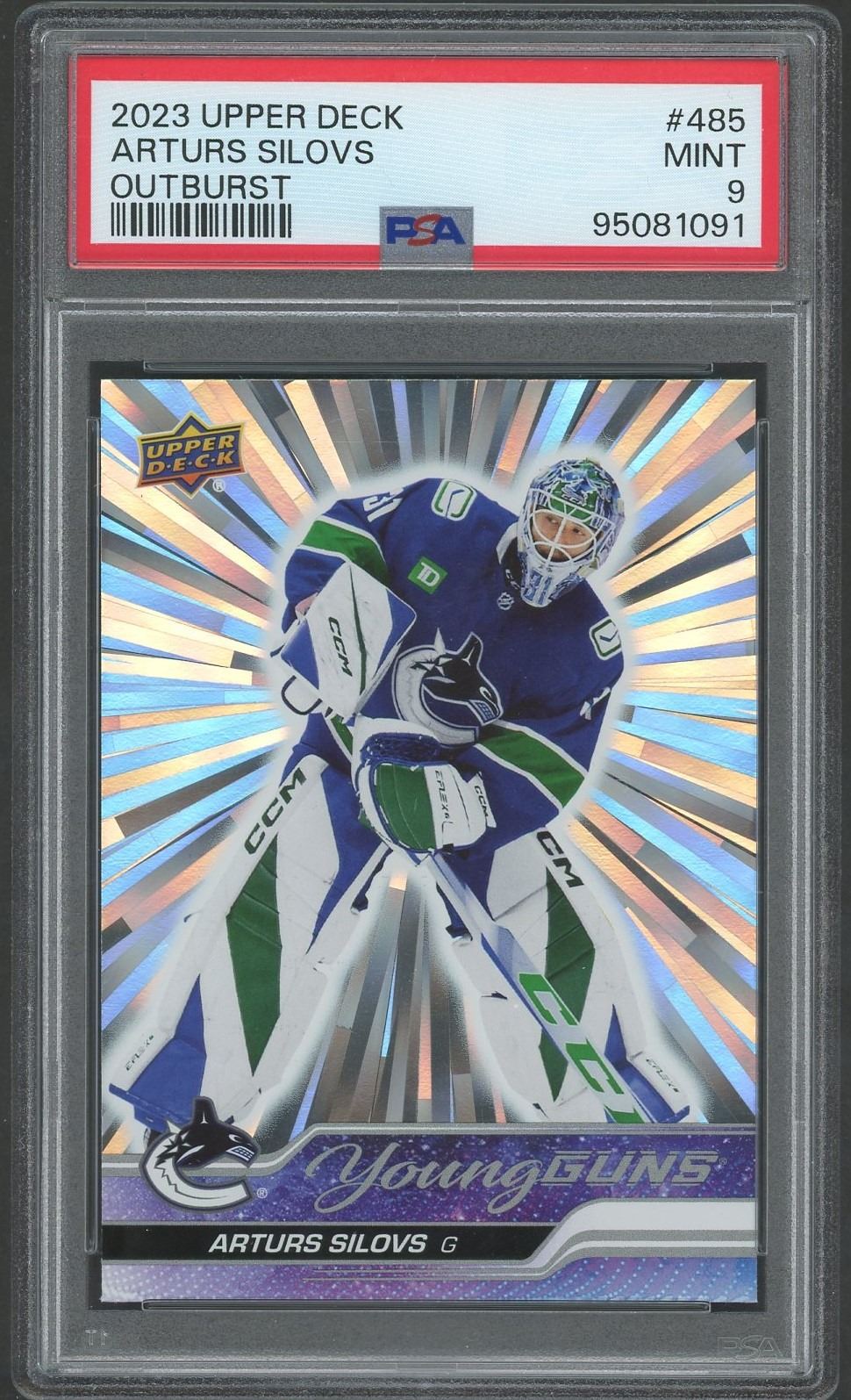 2023-24 UD Young Guns Silver Outburst SP rookie of Canucks top goalie prospect Arturs Silovs graded a mint 9 by PSA!