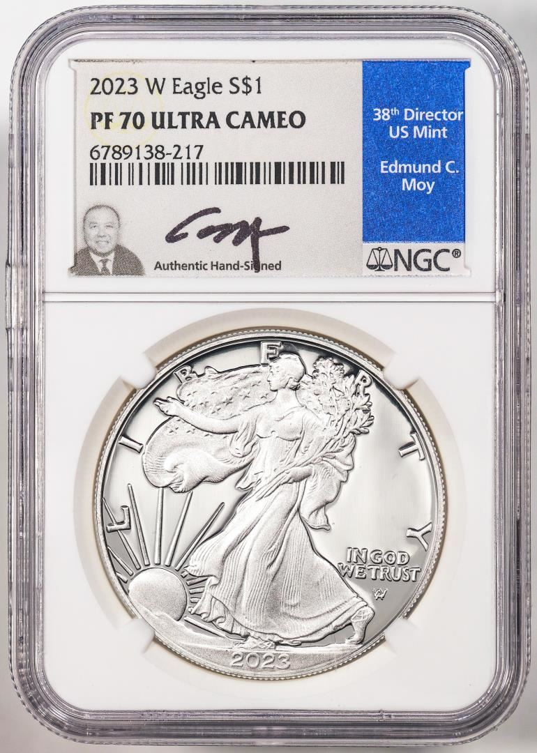 One 2023-W $1 Proof American Silver Eagle Coin NGC PF70 Ultra Cameo Edmund Moy Signature. NGC Certified.