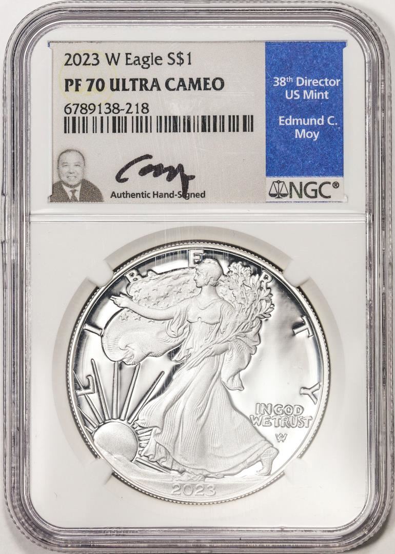 One 2023-W $1 Proof American Silver Eagle Coin NGC PF70 Ultra Cameo Edmund Moy Signature. NGC Certified.