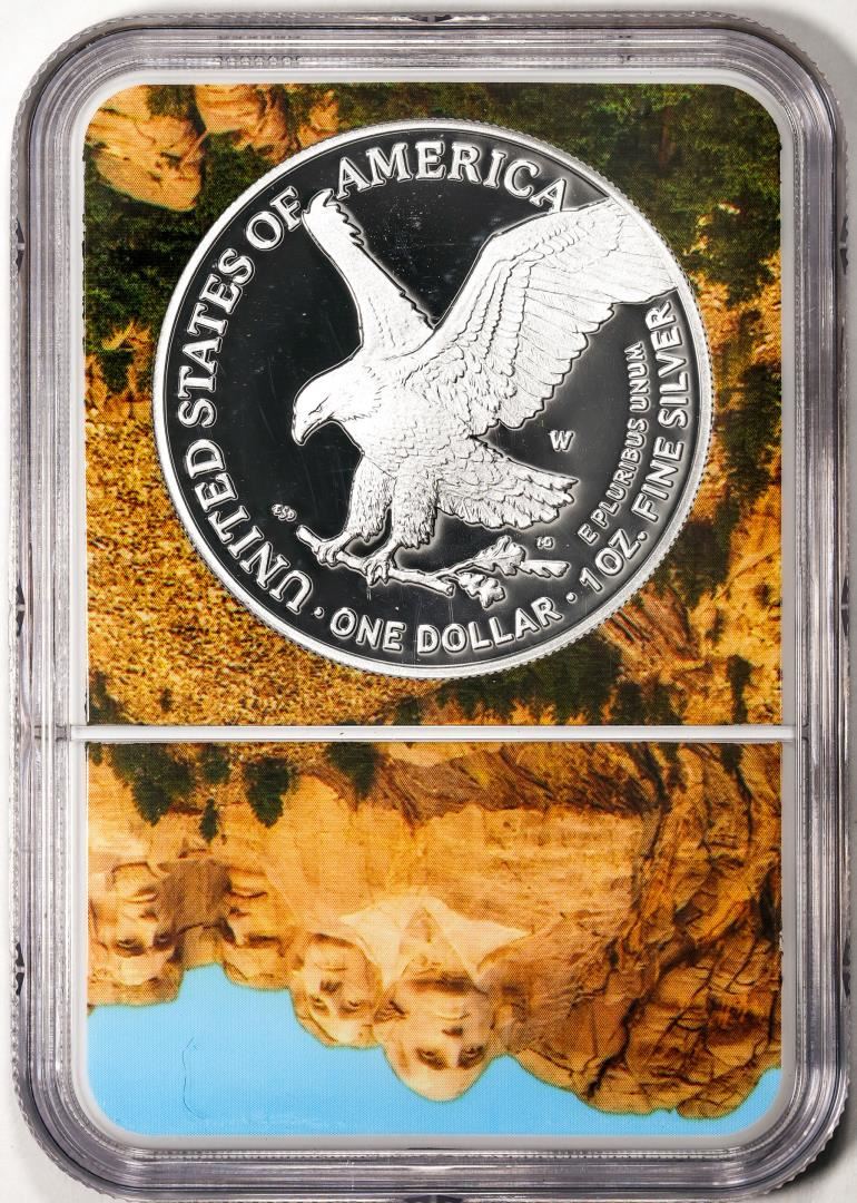 One 2023-W $1 Proof American Silver Eagle Coin NGC PF70 Ultra Cameo FDOI Mount Rushmore. NGC Certified.