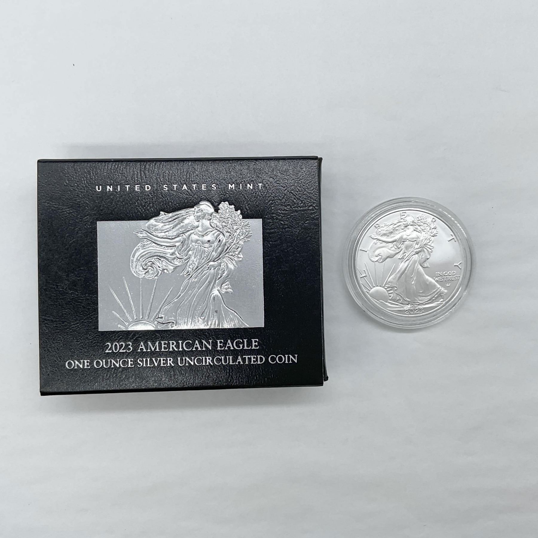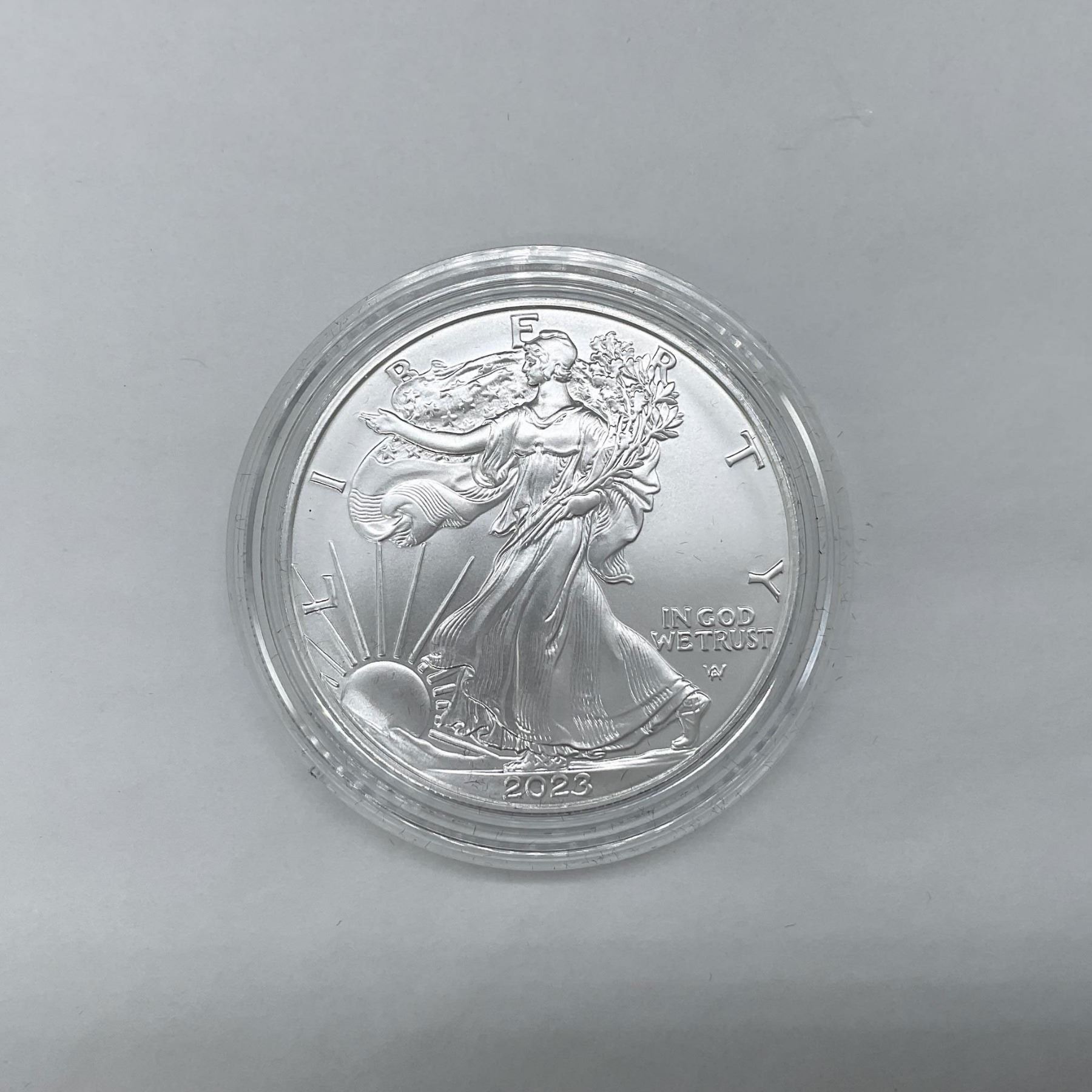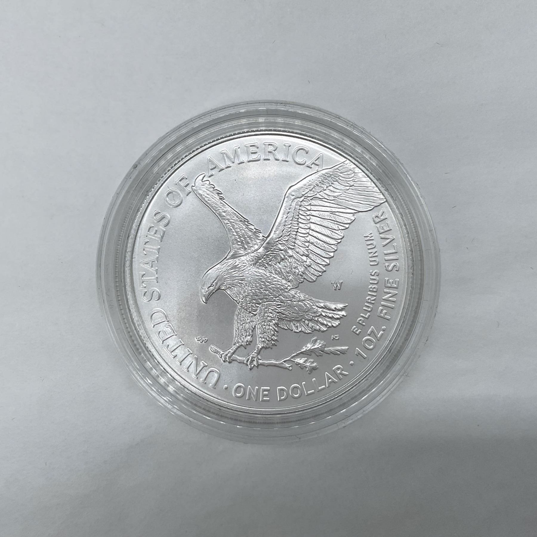 West Point Mint. The obverse side depicts Liberty in full stride. She is shown wrapped in the flag, her right hand is extended and her left arm is carrying laurel and oak branches. The reverse side features a bald eagle carrying an oak branch. The coin is in a protective case. The case is approximately: 0.25"D x 2" dia. This item has its original box: 3.75"L x 3"W x 1"H.