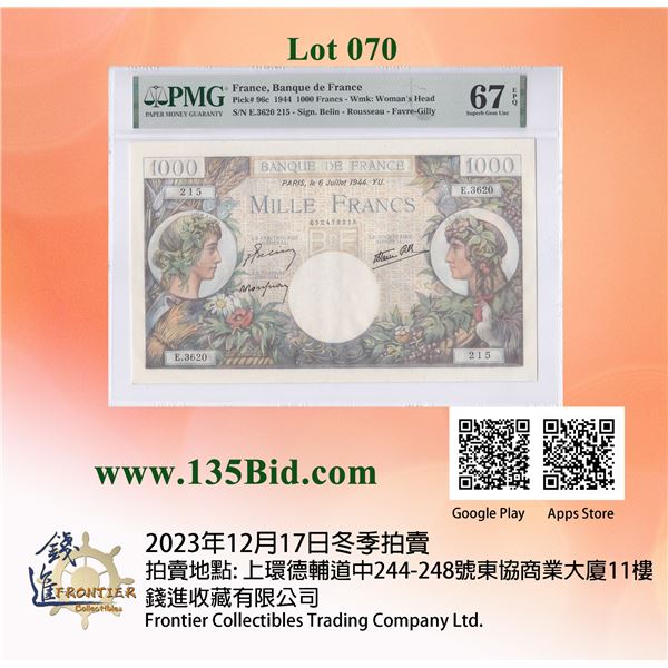 [冠軍分] 1944, 法國, 1000法郎, 編號: E.3620215. PMG 67EPQ.