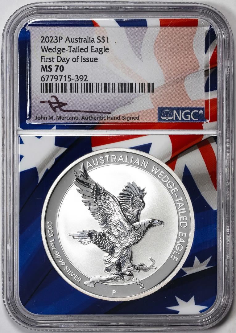 2023P Australia $1 Wedge Tailed Eagle Silver Coin NGC MS70 FDOI Flag Core Mercanti