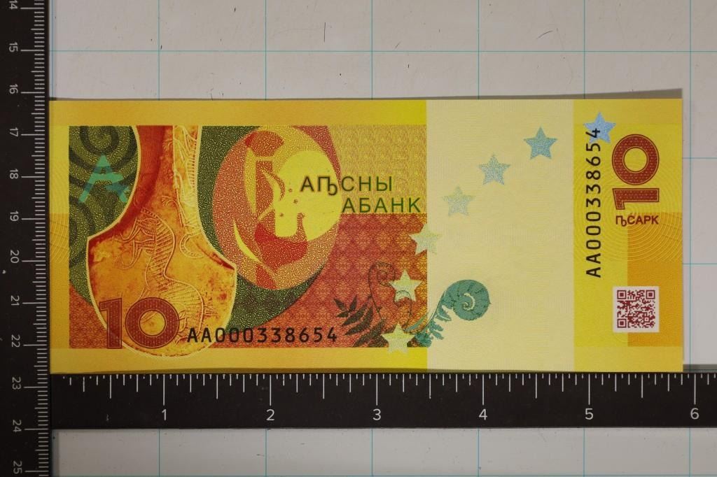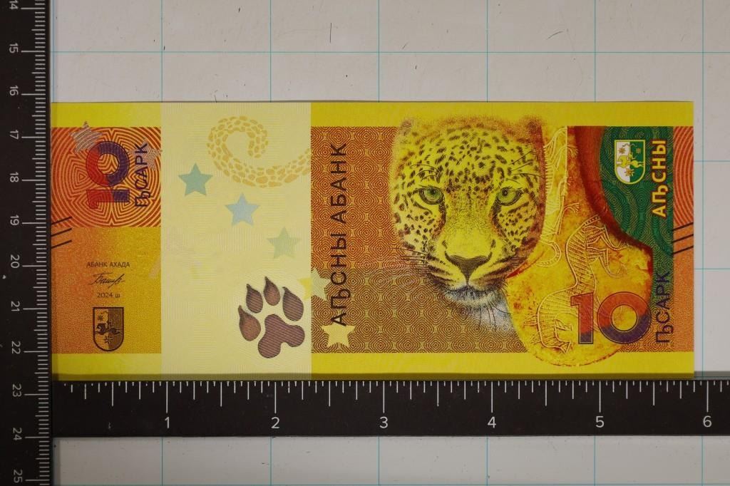 CAUCASIAN LEOPARD AND AN ANCIENT BRONZE AXE ON THE OBVERSE. IT IS A COMMEMORATIVE BANK NOTE WORTH ROUGHLY $4.39 USD IN JULY OF 2024, CRISP UNC