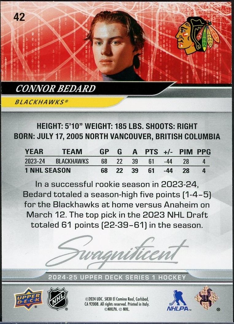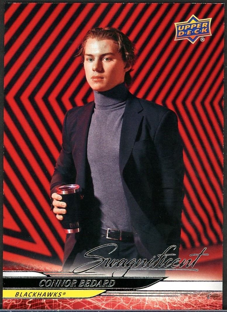 2024-25 UD Series 1 Swagnificent SSP of star Blackhawks forward Connor Bedard.