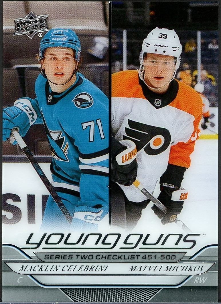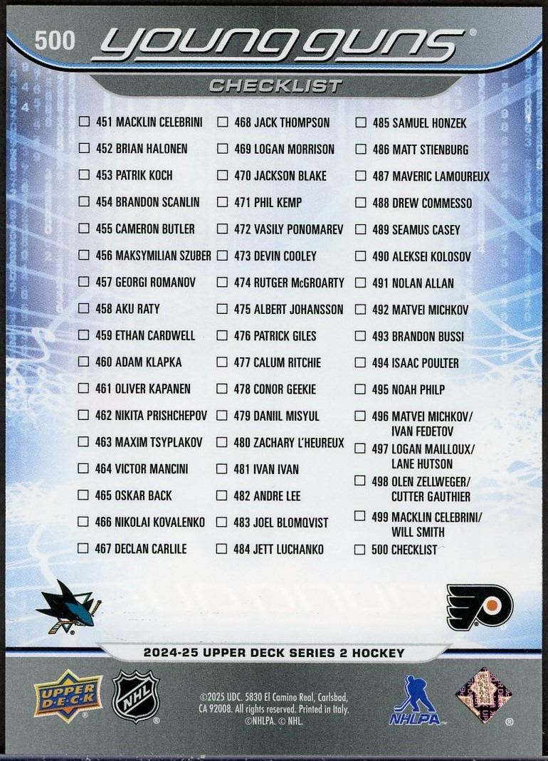 2024-25 UD Young Guns clear cut checklist featuring Matvei Michkov and Macklin Celebrini