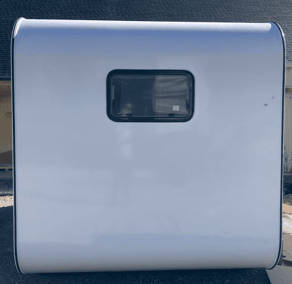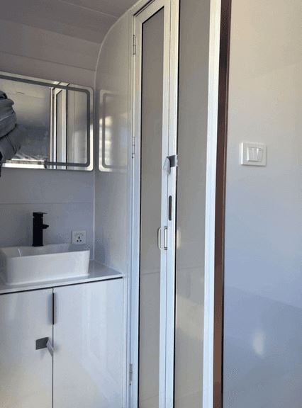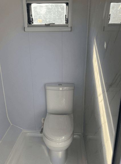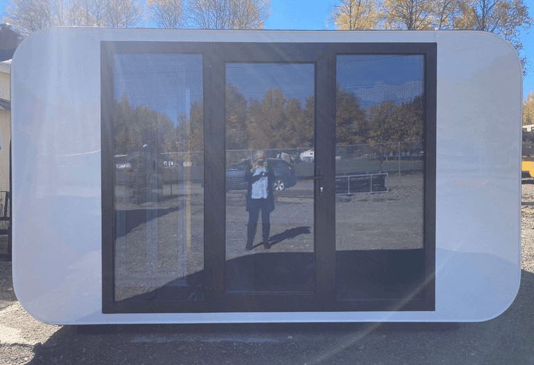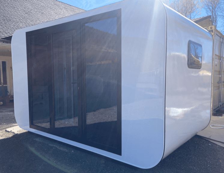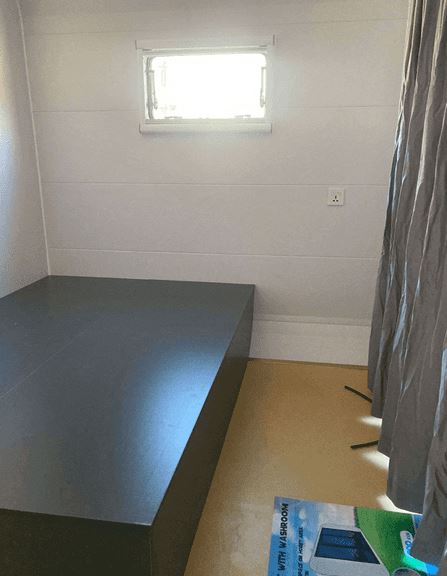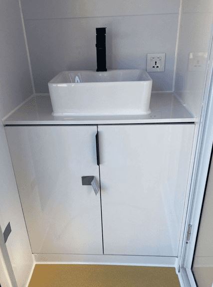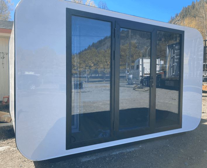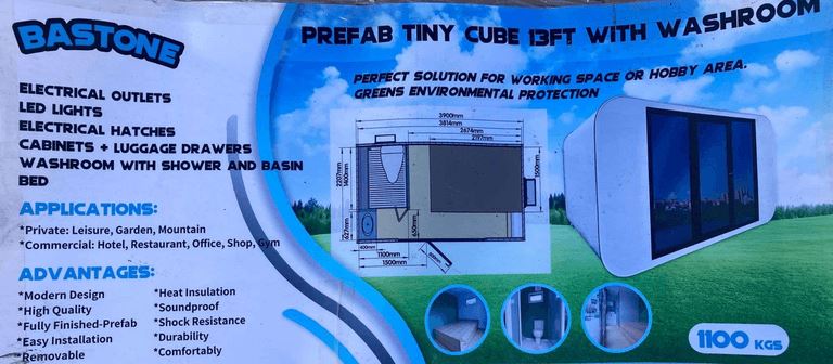 Unused 2024 Bastone 110V mobile prefab cube house, electrical outlets, LED lights, cabinets & amp; luggage drawers, washroom with shower and basin and bed base, curtains. Approx. weight 1100 kgs. Measures 13' x 7'4". & nbsp;Check with your local bylaws for permit requirements.& nbsp;