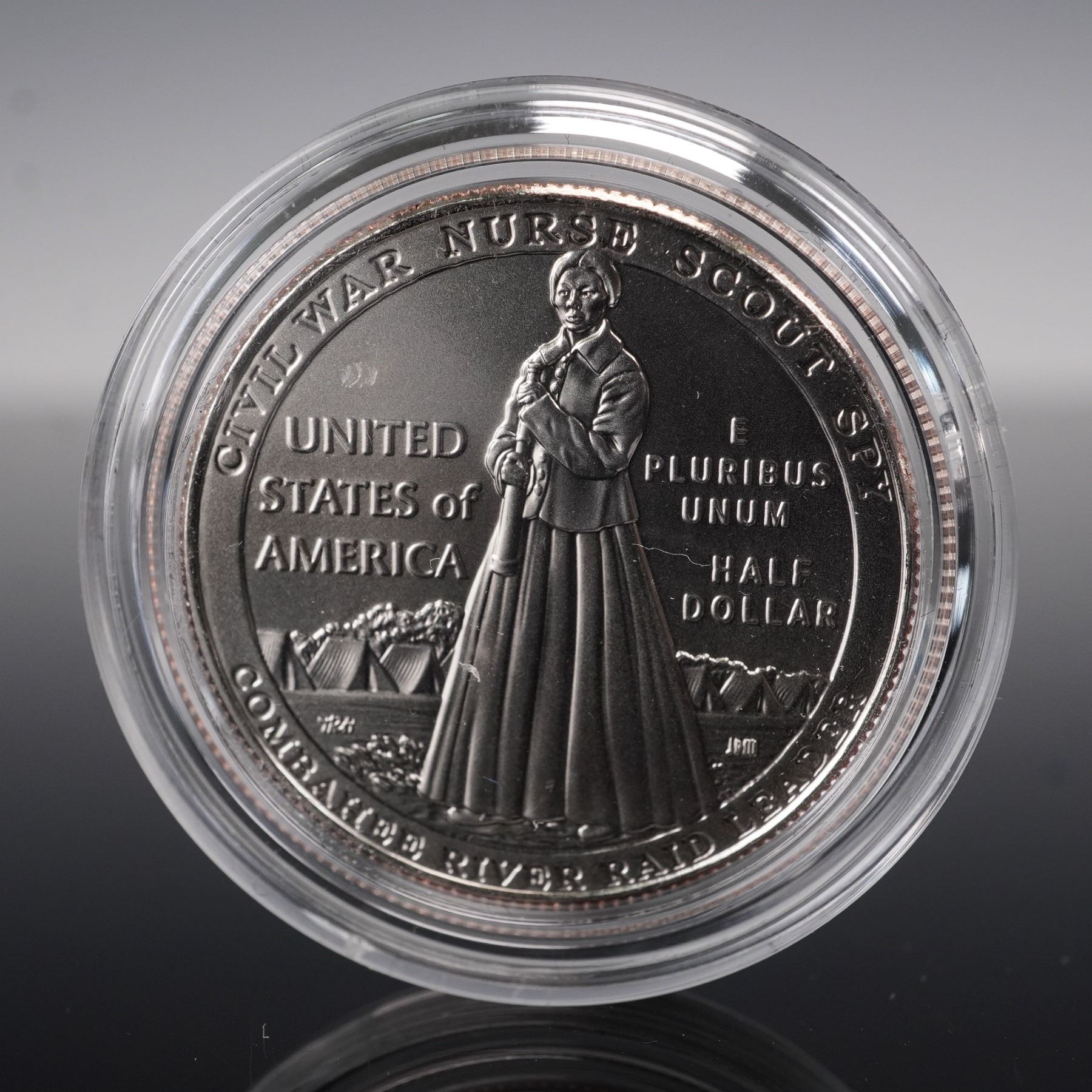 Uncirculated 2024-D Harriet Tubman commemorative half dollar issued by the United States Mint as part of the Harriet Tubman Commemorative Coin Program. The obverse features a portrait of Harriet Tubman with arms crossed, set against the backdrop of two Civil War-era steamboats. This side commemorates her leadership in the Combahee River Raid during the Civil War, which resulted in the liberation of over 700 enslaved individuals. Inscriptions include LIBERTY, IN GOD WE TRUST, HARRIET TUBMAN, and 2024. The reverse displays Tubman holding a spyglass before a row of Civil War-era tents, symbolizing her service as a scout and spy for the Union Army. Surrounding text reads CIVIL WAR NURSE SCOUT SPY, UNITED STATES OF AMERICA, E PLURIBUS UNUM, HALF DOLLAR, and COMBAHEE RIVER RAID 1863. This half dollar is struck in uncirculated finish with a composition of 8.33% nickel and balance copper. The coin weighs 11.34 grams. It features a reeded edge and bears the Denver Mint mark (D). Comes housed in its original United States Mint presentation box with black velvet display, accompanied by a Certificate of Authenticity. Coin diameter: 30.61mm. U.S. Mint box: 3.5"L x 3.5"W x 1"H.
