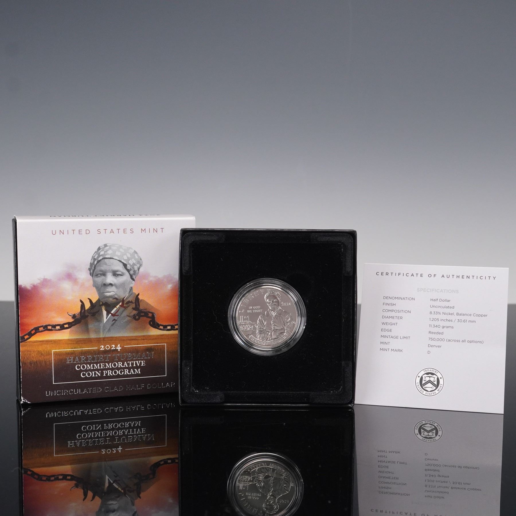 Uncirculated 2024-D Harriet Tubman commemorative half dollar issued by the United States Mint as part of the Harriet Tubman Commemorative Coin Program. The obverse features a portrait of Harriet Tubman with arms crossed, set against the backdrop of two Civil War-era steamboats. This side commemorates her leadership in the Combahee River Raid during the Civil War, which resulted in the liberation of over 700 enslaved individuals. Inscriptions include LIBERTY, IN GOD WE TRUST, HARRIET TUBMAN, and 2024. The reverse displays Tubman holding a spyglass before a row of Civil War-era tents, symbolizing her service as a scout and spy for the Union Army. Surrounding text reads CIVIL WAR NURSE SCOUT SPY, UNITED STATES OF AMERICA, E PLURIBUS UNUM, HALF DOLLAR, and COMBAHEE RIVER RAID 1863. This half dollar is struck in uncirculated finish with a composition of 8.33% nickel and balance copper. The coin weighs 11.34 grams. It features a reeded edge and bears the Denver Mint mark (D). Comes housed in its original United States Mint presentation box with black velvet display, accompanied by a Certificate of Authenticity. Coin diameter: 30.61mm. U.S. Mint box: 3.5"L x 3.5"W x 1"H.