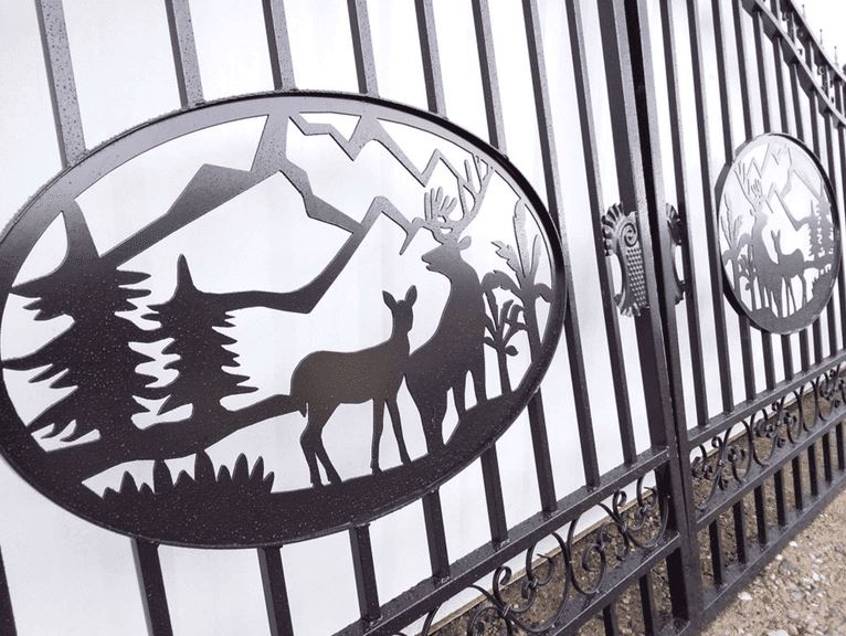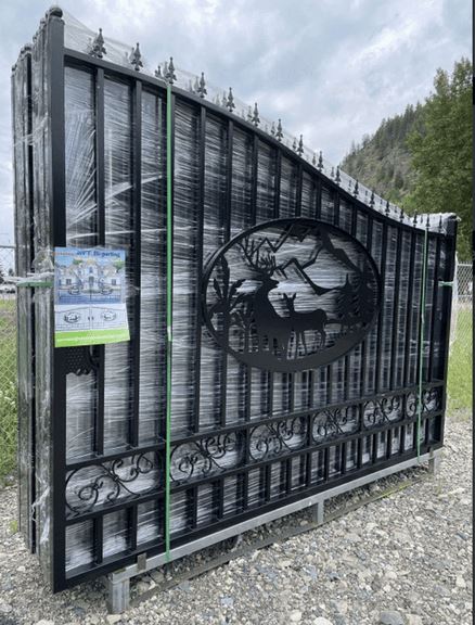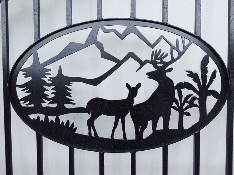 Unused 2024 Greatbear 20' bi-parting iron gate. With artwork "Deer" in the middle of the gate frame.