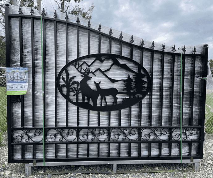 Unused 2024 Greatbear 20' bi-parting iron gate. With artwork "Deer" in the middle of the gate frame.