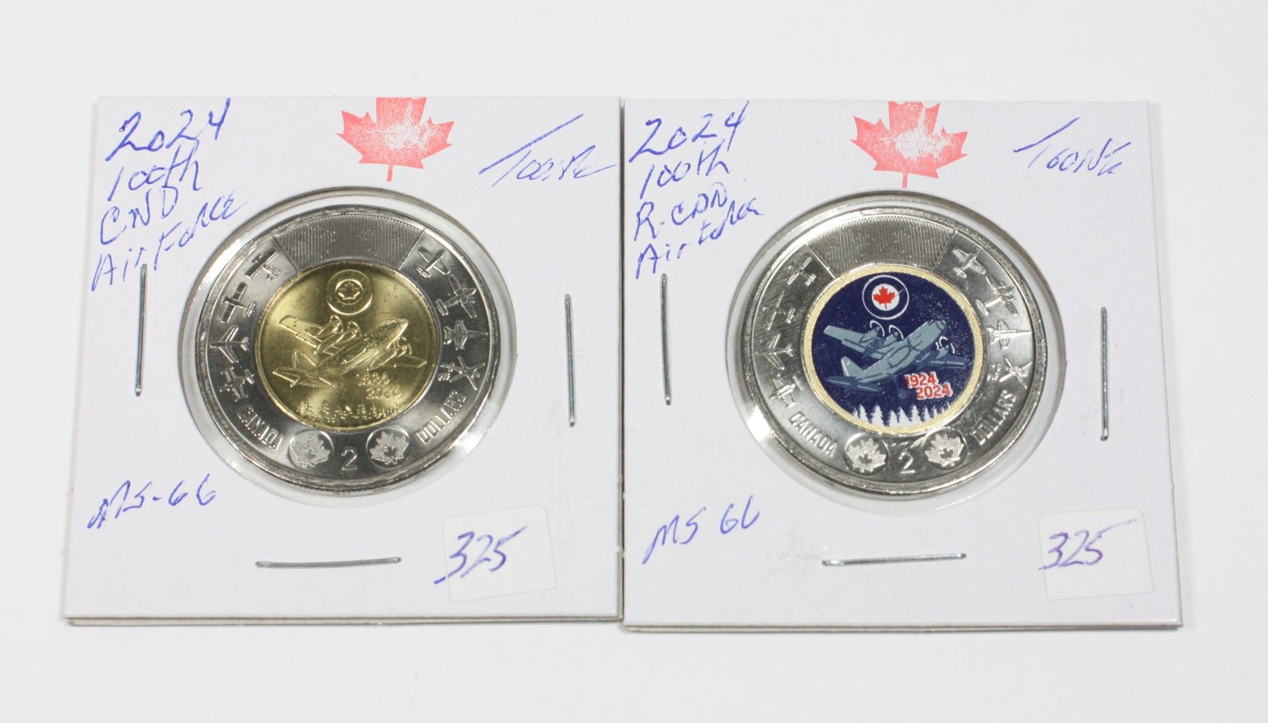 CANADIAN AIR FORCE COLORED AND NON COLORED TOONIE FROM ROYAL CANADIAN MINT COIN EXCHANGE MS-66