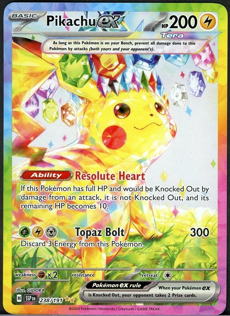 2024 Pokémon Pikachu EX SIR from Surging Sparks. Card is in NM cond