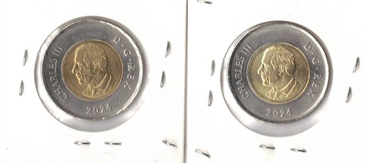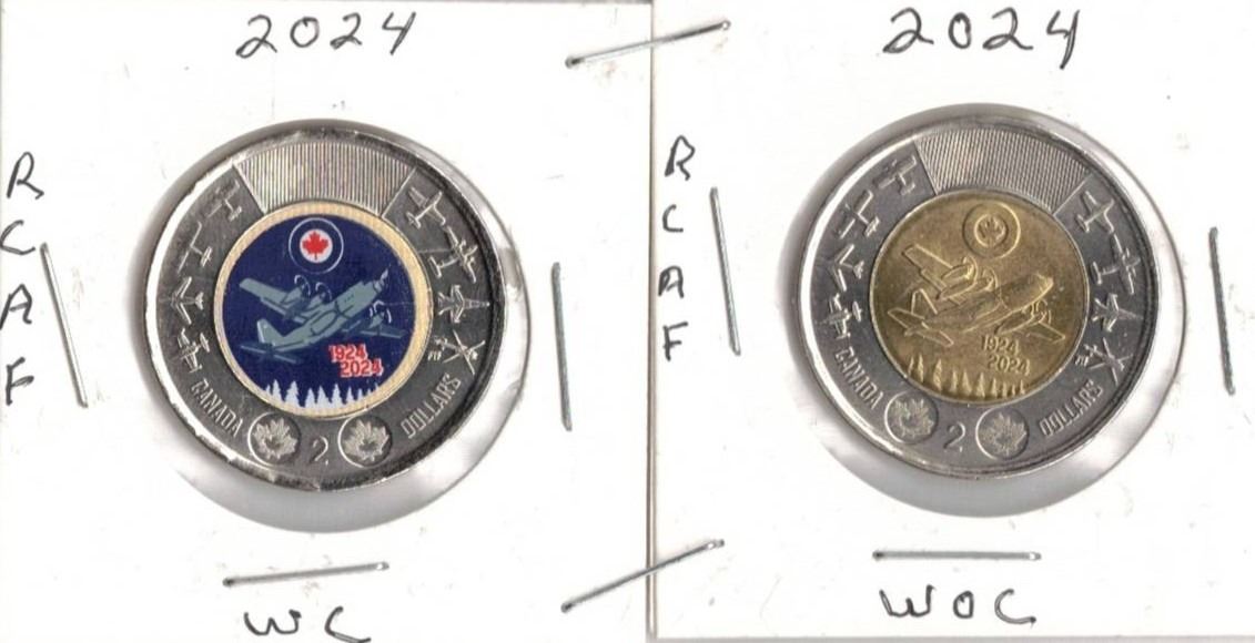 2024 Canadian \$2 commemorative toonie, which honors the 100th anniversary of the Royal Canadian Air Force (RCAF). The image shows both the colored and non-colored versions of the coin.