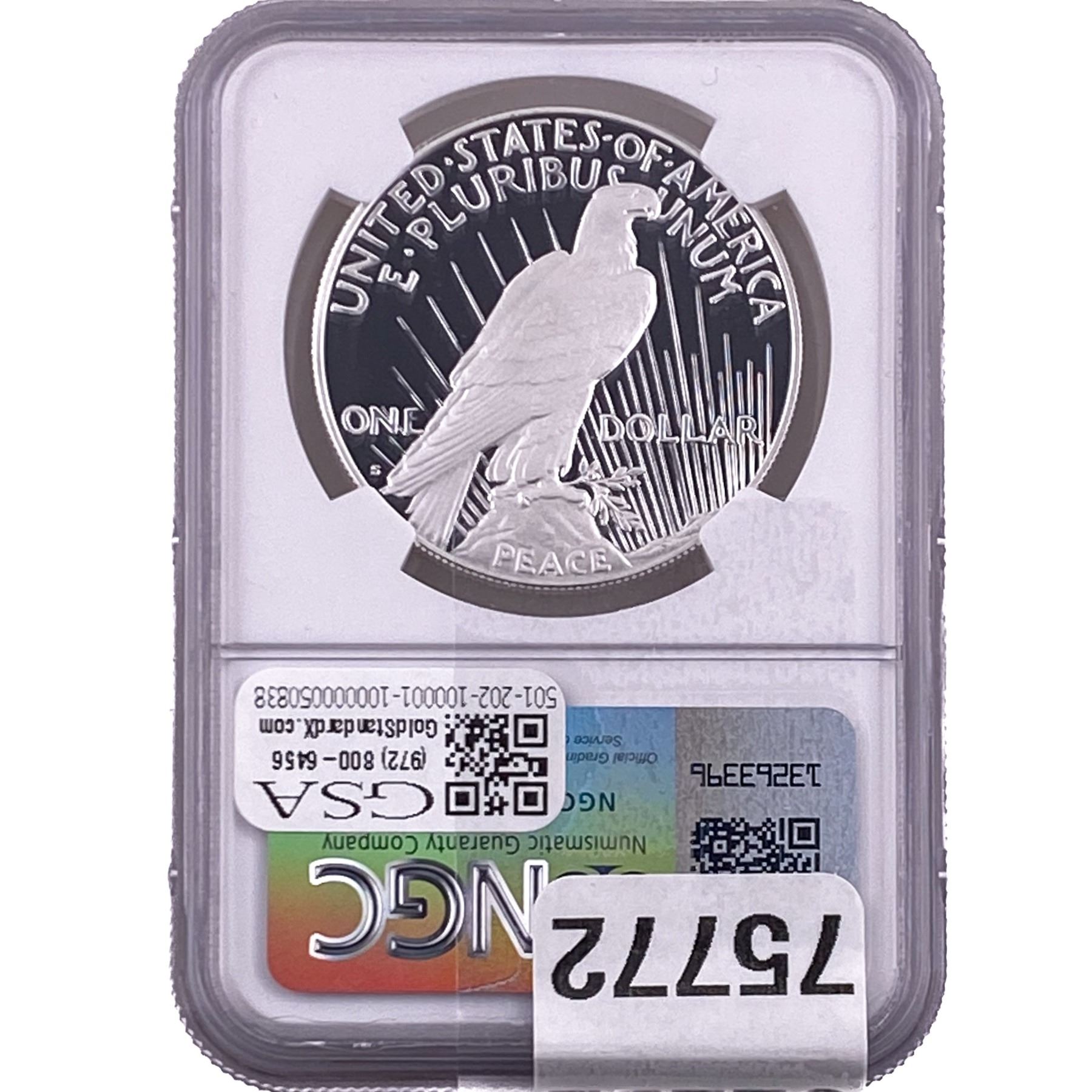 e. Coins sold referencing a third-party grading service are sold “AS IS” without any express or implied warranty, except for a guarantee by GSA that they are genuine. Removal or alteration of the holder, voids all of Bidder’s claims concerning that Product. Certain warranties may be available from the grading services and Bidders are referred to them for further details: Numismatic Guaranty Corporation (NGC), PO Box 4776, Sarasota, FL 34230, www.ngccoin.com/services/writtenguarantee.asp; Professional Coin Grading Services (PCGS), PO Box 9458, Newport Beach, CA 92658, www.pcgs.com/guarantee.html; ANACS, 6555 S. Kenton St., Ste. 303, Englewood, CO 80111; and Independent Coin Grading Co. (ICG), 7901 East Bellview, Ave., Suite 50, Englewood, CO 80111.