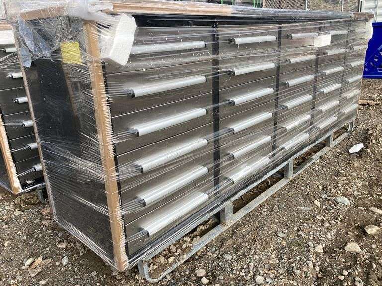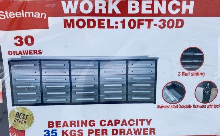 Unused 2024 Steelman stainless steel 10' workbench with 30 drawers. Drawers with lock and anti-slip inners. Using new 3 rail sliding, stainless steel top. Approx. weight 290 kg., approx. measurement 2870mm x 610mm x 1100mm
