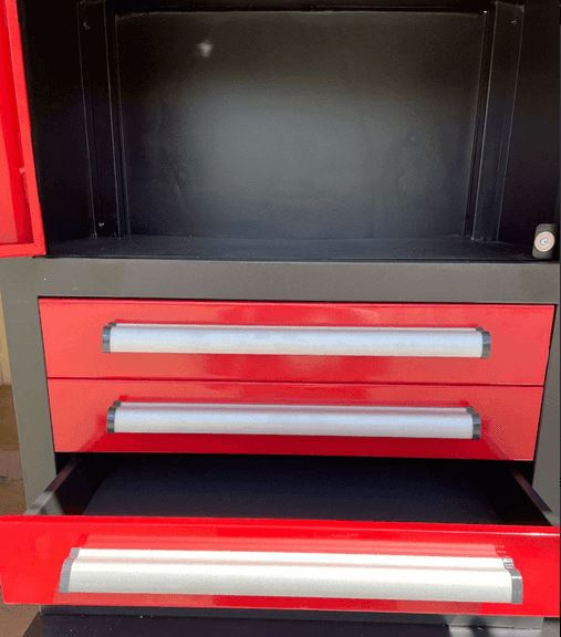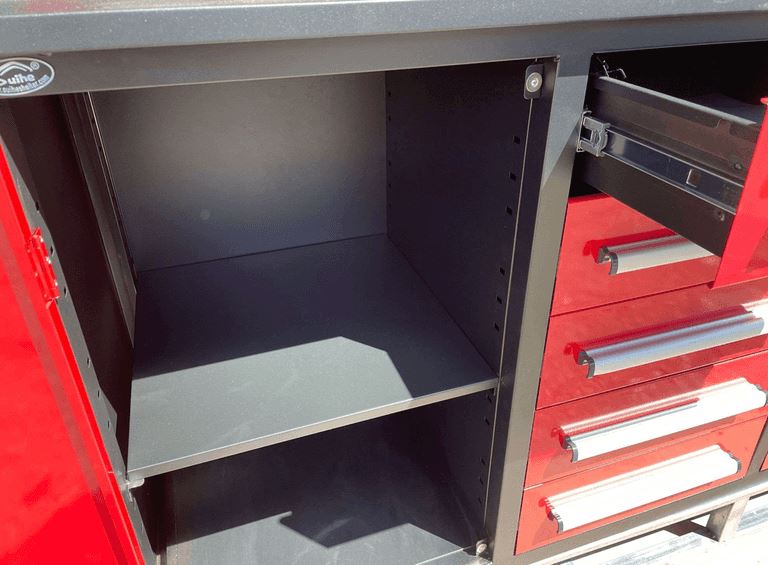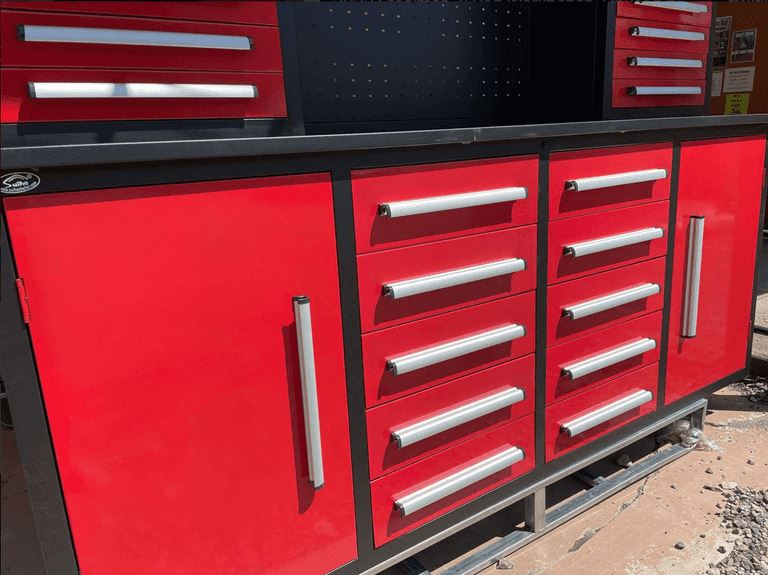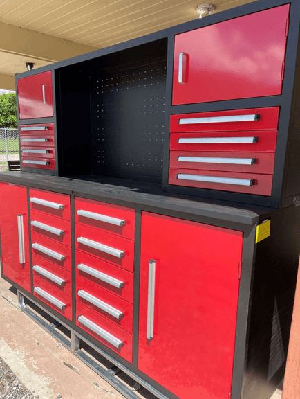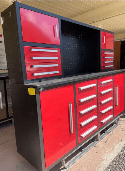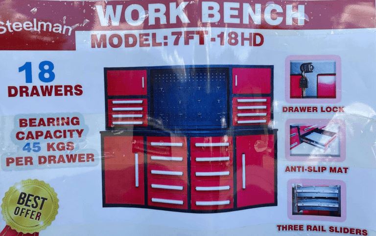 Unused 2024 Steelman 7' red workbench with 18 drawers. Drawers with lock and anti-slip inners, using new 3 rail sliders.