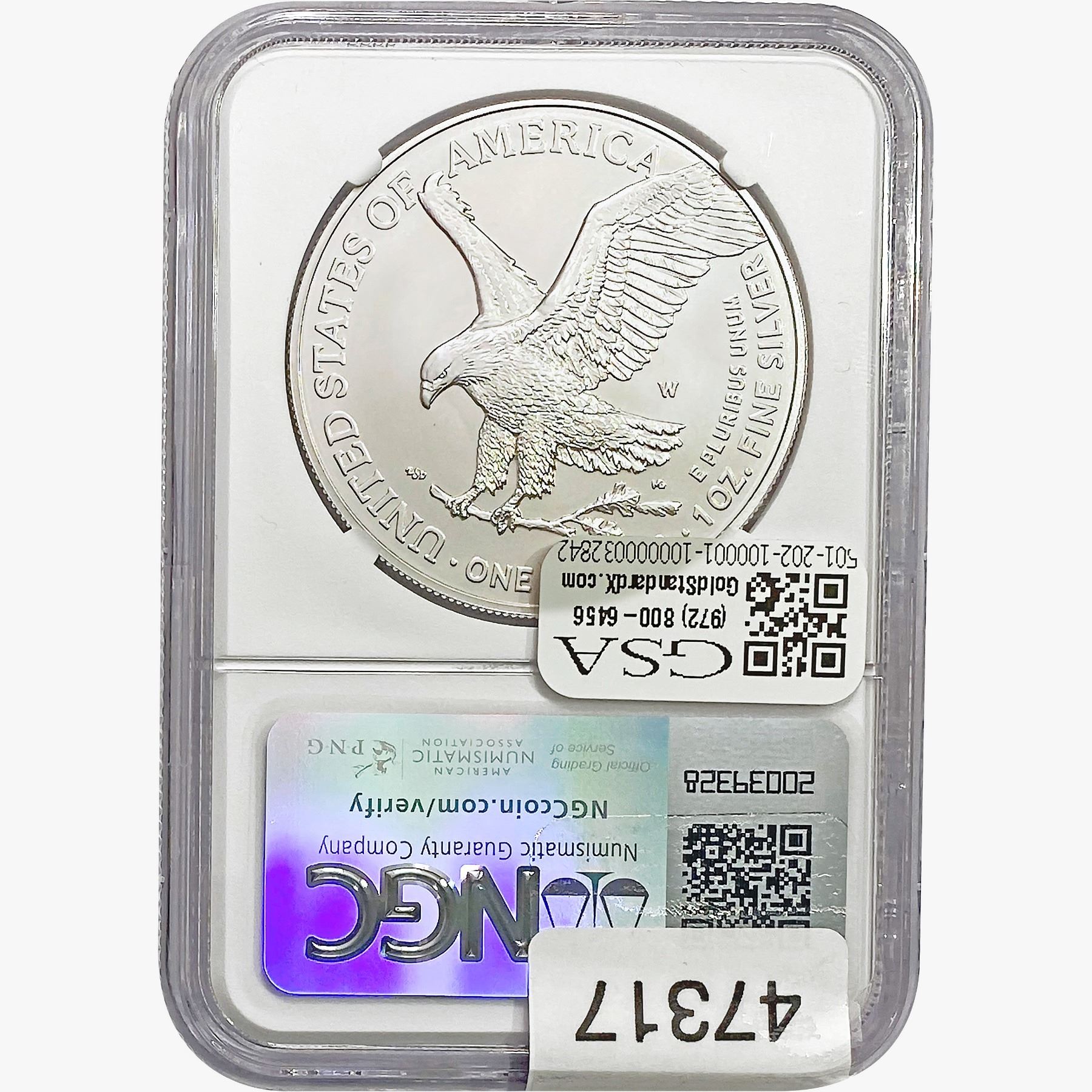 e. Coins sold referencing a third-party grading service are sold “AS IS” without any express or implied warranty, except for a guarantee by GSA that they are genuine. Removal or alteration of the holder, voids all of Bidder’s claims concerning that Product. Certain warranties may be available from the grading services and Bidders are referred to them for further details: Numismatic Guaranty Corporation (NGC), PO Box 4776, Sarasota, FL 34230, www.ngccoin.com/services/writtenguarantee.asp; Professional Coin Grading Services (PCGS), PO Box 9458, Newport Beach, CA 92658, www.pcgs.com/guarantee.html; ANACS, 6555 S. Kenton St., Ste. 303, Englewood, CO 80111; and Independent Coin Grading Co. (ICG), 7901 East Bellview, Ave., Suite 50, Englewood, CO 80111.