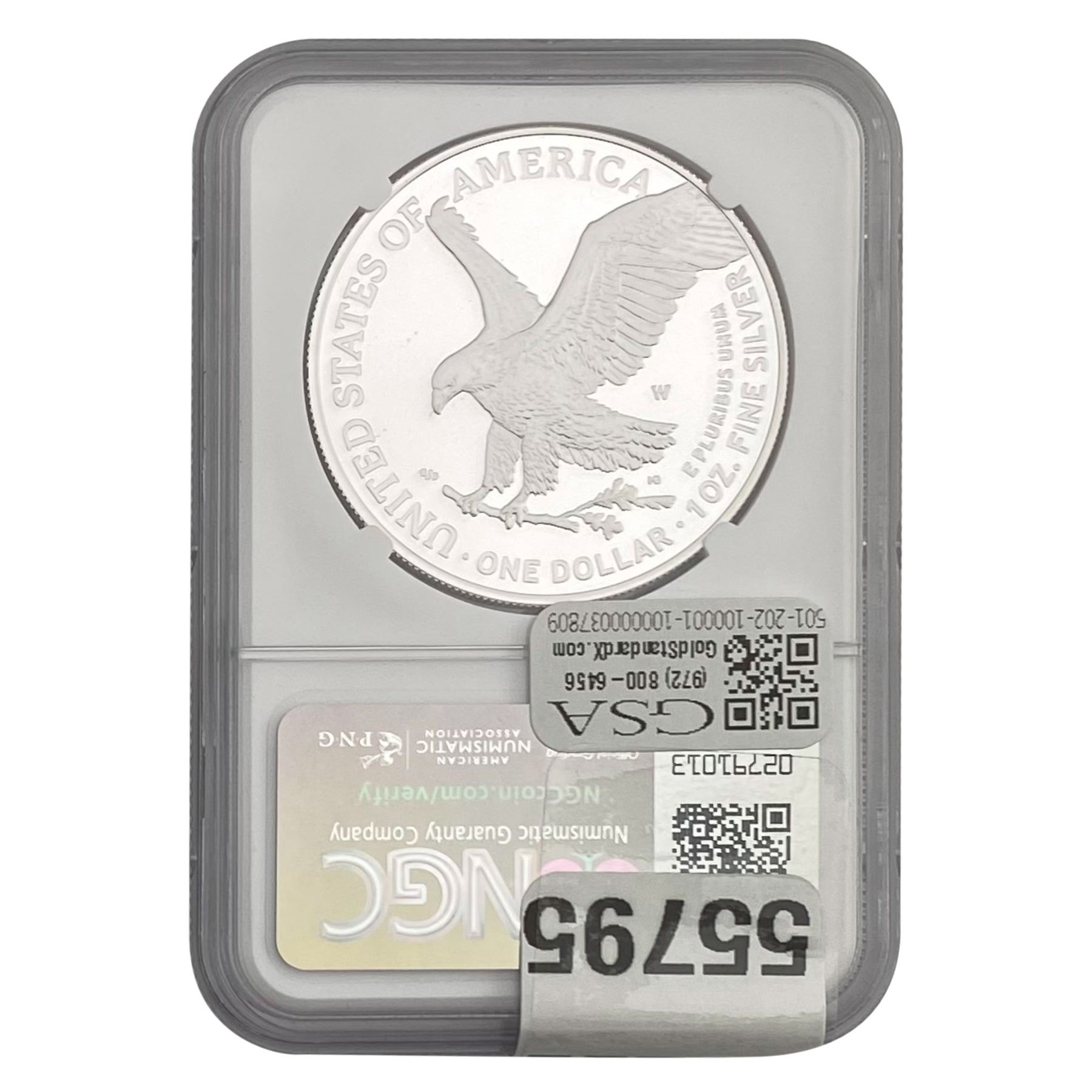 e. Coins sold referencing a third-party grading service are sold “AS IS” without any express or implied warranty, except for a guarantee by GSA that they are genuine. Removal or alteration of the holder, voids all of Bidder’s claims concerning that Product. Certain warranties may be available from the grading services and Bidders are referred to them for further details: Numismatic Guaranty Corporation (NGC), PO Box 4776, Sarasota, FL 34230, www.ngccoin.com/services/writtenguarantee.asp; Professional Coin Grading Services (PCGS), PO Box 9458, Newport Beach, CA 92658, www.pcgs.com/guarantee.html; ANACS, 6555 S. Kenton St., Ste. 303, Englewood, CO 80111; and Independent Coin Grading Co. (ICG), 7901 East Bellview, Ave., Suite 50, Englewood, CO 80111.