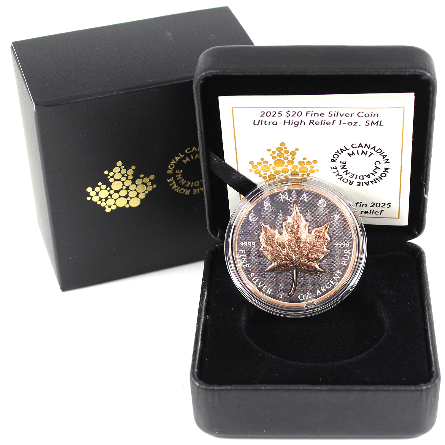 Coin is 1oz and .9999 fine with selective rose gold plating and a dynamic tree pattern in the field representing Canada's forests. (Tax Exempt)