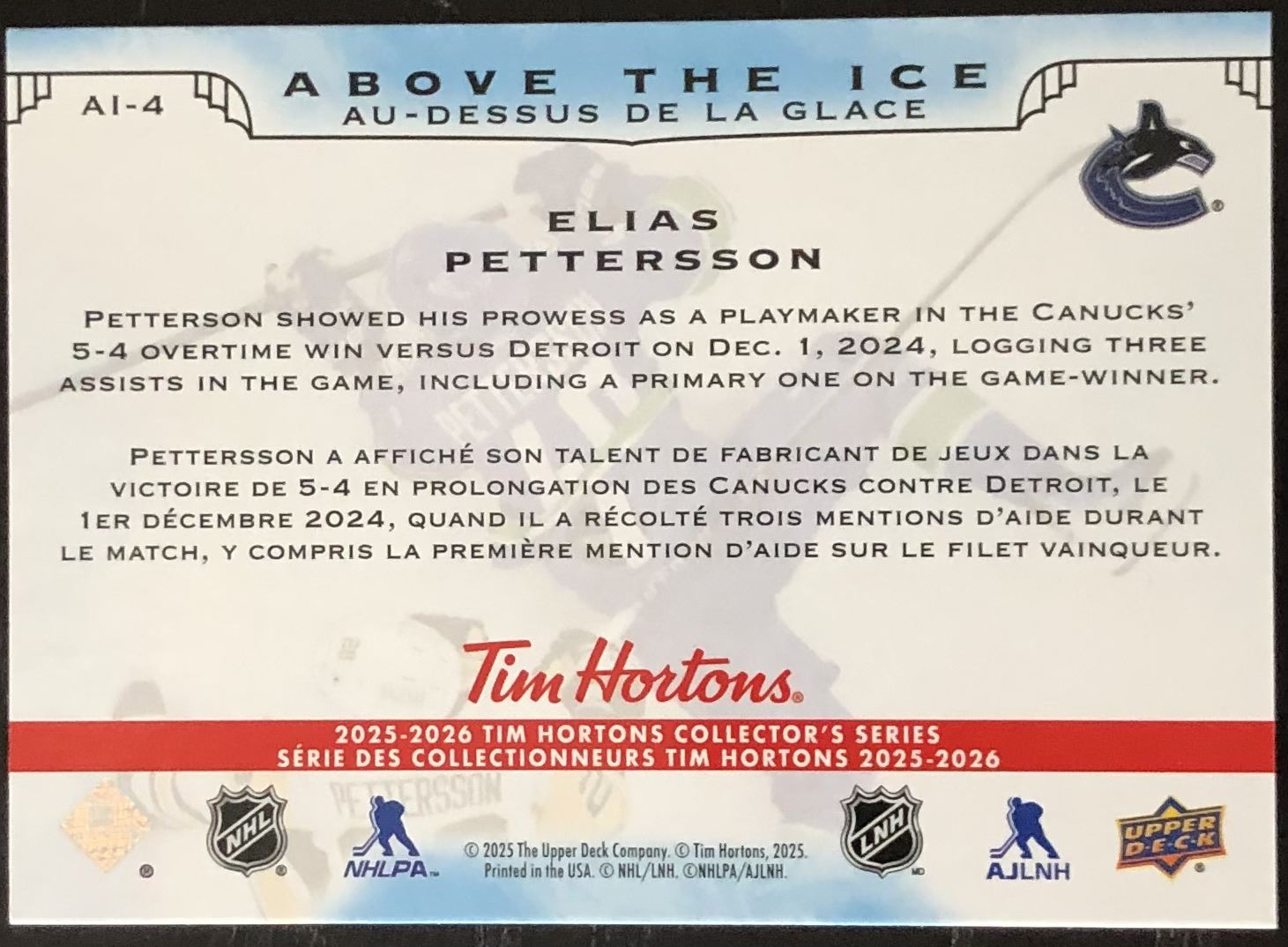 Tim Hortons card #AI-4 NHL, hockey, UD, regional