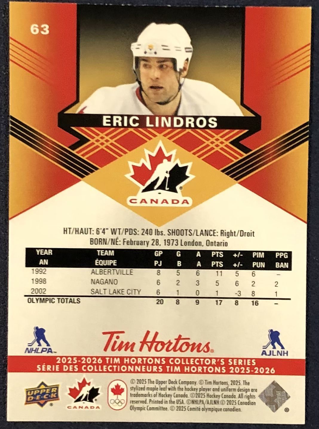 Tim Hortons card #63 NHL, hockey, UD, regional, hall of fame