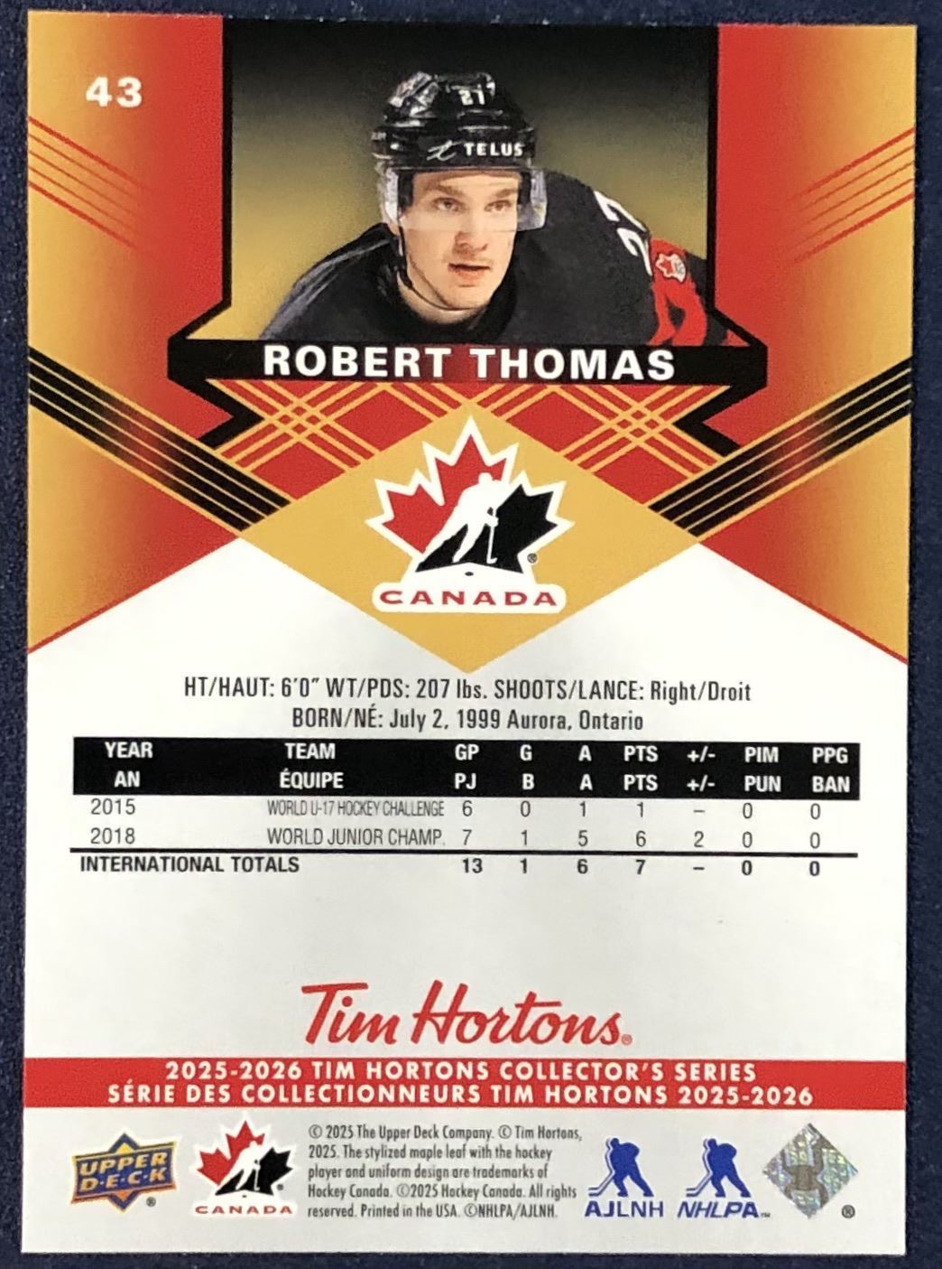 Tim Hortons card #43 NHL, hockey, UD, regional