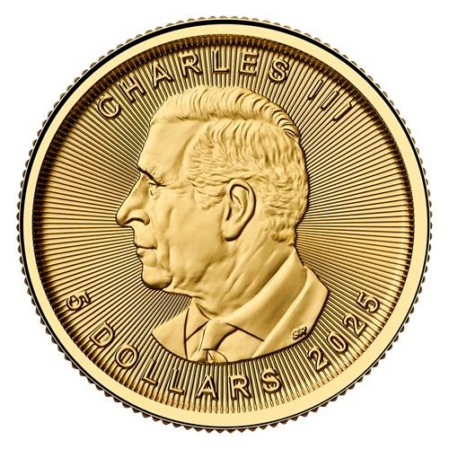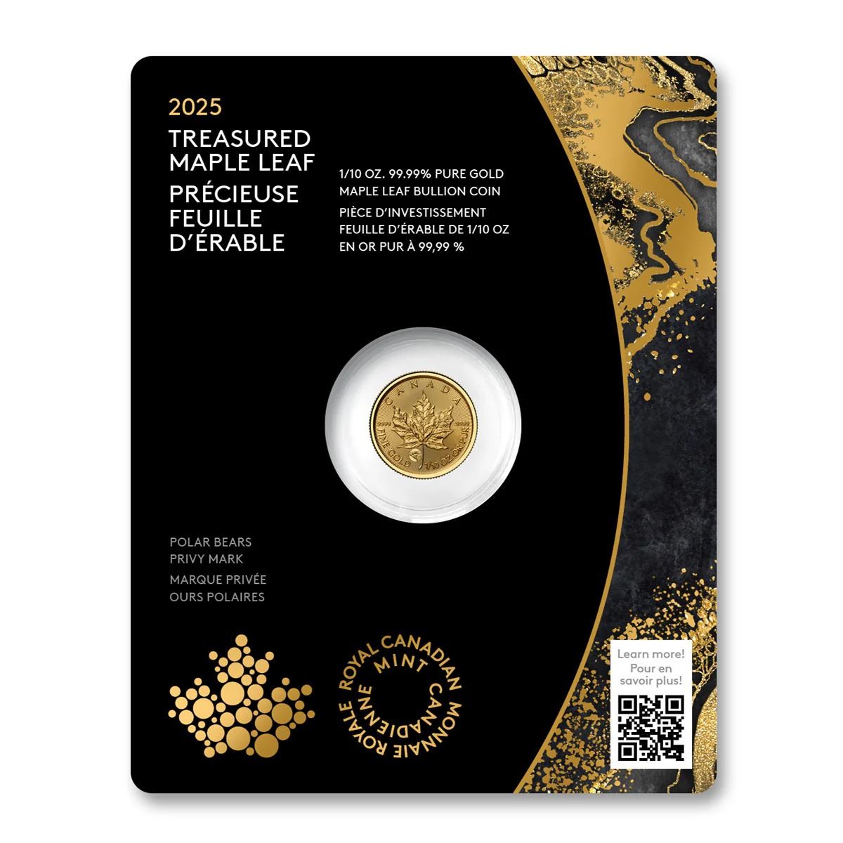 SOLD OUT - The Treasured Gold Maple Leaf is a Premium Bullion in special packaging product that is made for celebrating life’s memorable moments. The 2025 Treasured Gold Maple Leaf bullion coin makes it easy to give or collect 99.99% pure gold—a lasting gift that is both precious and pure. HST/GST Exempt. The Design: The 2025 Treasured Gold Maple Leaf bullion coin makes it easy to give or receive the gift of 99.99% pure gold—a lasting gift that is both precious and pure. Bearing a special privy mark featuring two polar bears to help you mark the moment, and every Treasured Gold Maple Leaf delivers the quality, artistry and purity the world has come to expect from Canada’s mint. Details FEATURES: Produced By: RCM Denomination: $5 Year: 2025 TECHNICAL SPECS: Diameter: 16.00 mm Material: Gold Fineness: 0.9999 Weight: 3.11 grams Bullion Weight: 0.1 Troy Ounces EXTENDED INFORMATION: Reverse: Silver Maple Leaf with Polar Bears Privy Mark Artist: Walter OTT Finish: Bullion with radial lines Quantity Produced: 5,000 Monarch: King Charles III