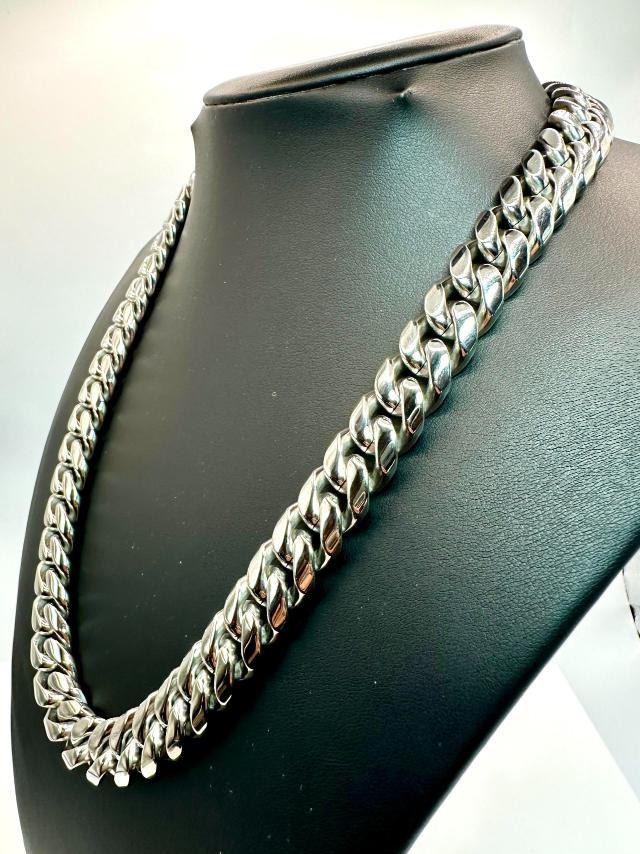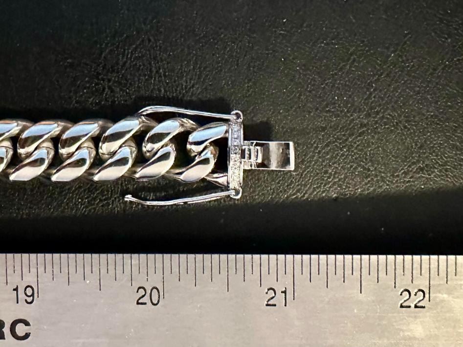 Huge 203.5 Gram 14 Kt White Gold-Plated Cuban Link Necklace. This necklace is 20 inches long and is a thick 14 mm wide. Secured with a Double Safety Clasp. This necklace weighs in at a Stealth 203.5 Total Grams. This High-Quality Necklace Looks Fantastic.