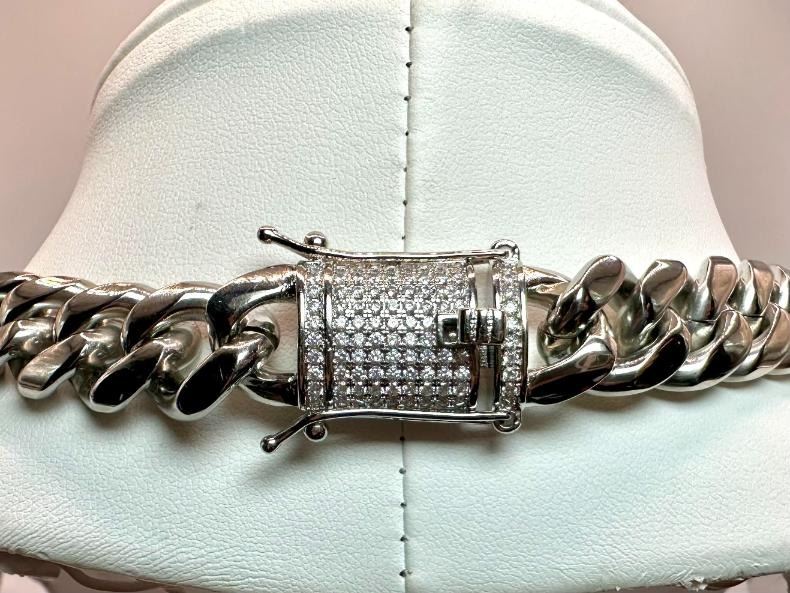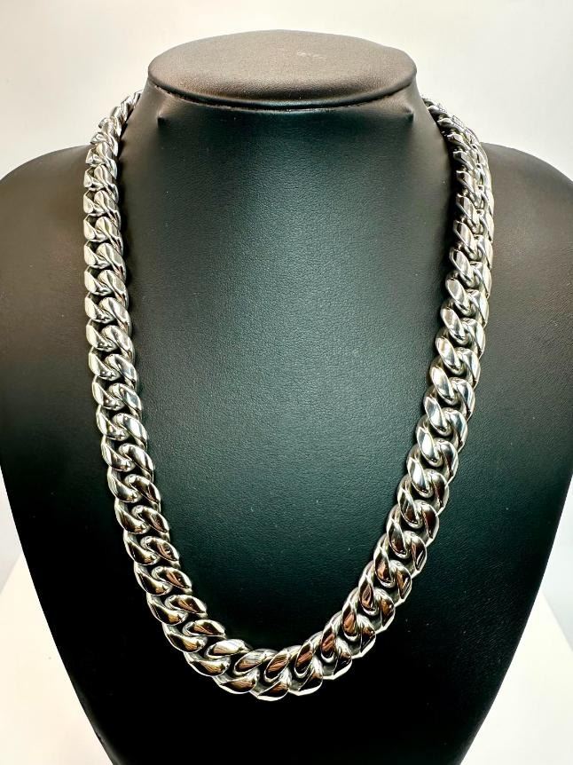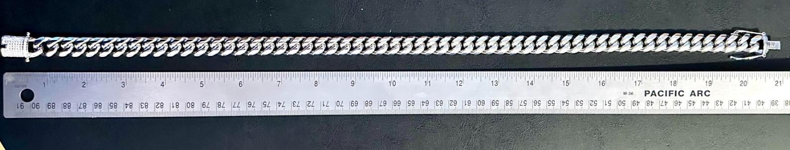 Huge 203.5 Gram 14 Kt White Gold-Plated Cuban Link Necklace. This necklace is 20 inches long and is a thick 14 mm wide. Secured with a Double Safety Clasp. This necklace weighs in at a Stealth 203.5 Total Grams. This High-Quality Necklace Looks Fantastic.