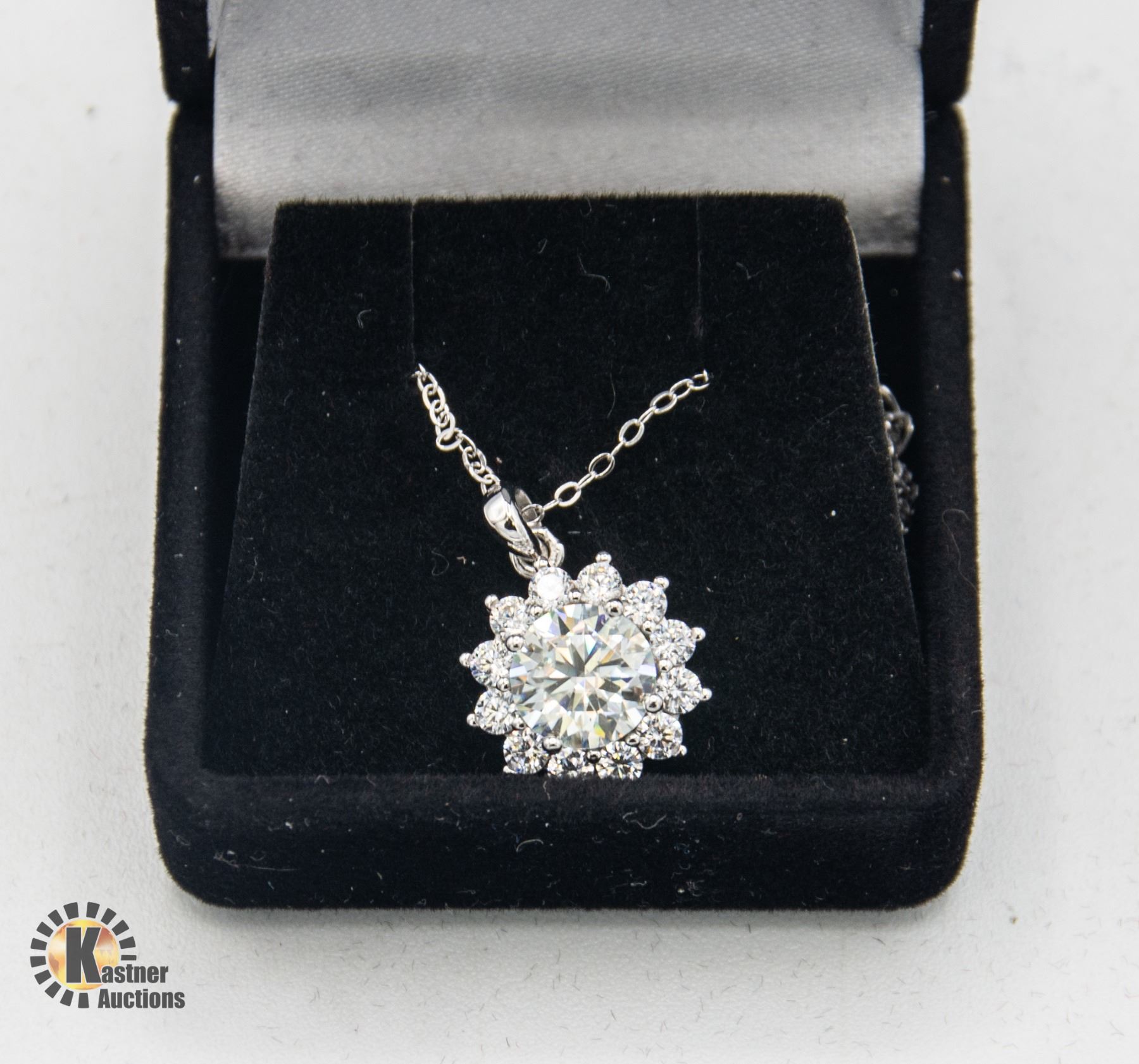 BRILLIANT CUT MOISSANITE STONE VVS D COLOR SURROUNDED BY 14 ROUND BRILLIANT CUT CUBIC ZIRCONIA SET IN 925 SILVER PENDANT RETAIL VALUE $1,175.00