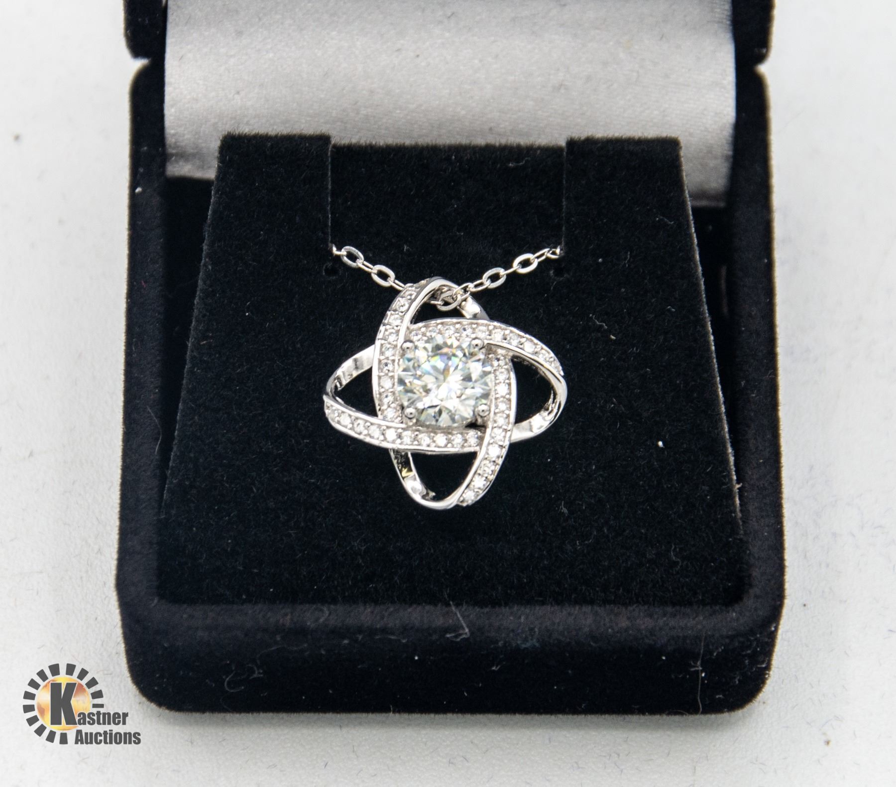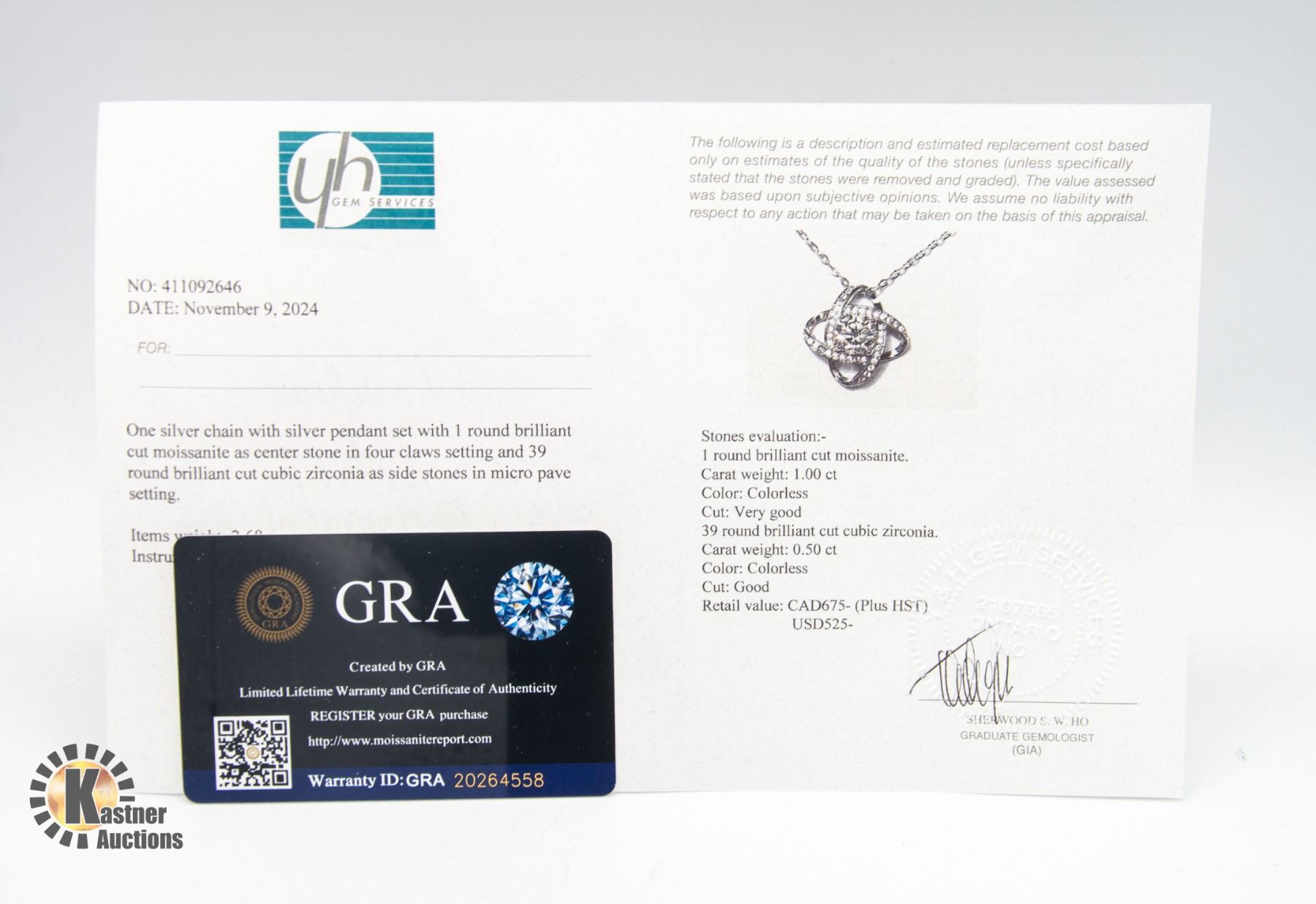 ROUND BRILLIANT CUT MOISSANITE STONE VVS D COLOR SET IN CENTER OF DUAL OVALS WITH ROUND BRILLIANT CUT CUBIC ZIRCONIA SET IN 925 SILVER PENDANT RETAIL VALUE $675.00