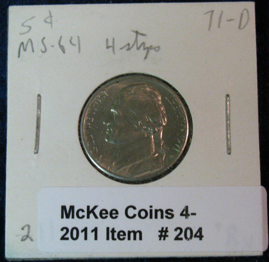 204. 1971 D Jefferson Nickel. MS 64. Four steps.