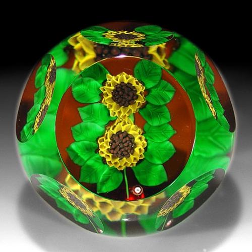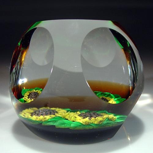 Caithness Glass 1998 "Sunflowers" paperweight, with two, brown-centered, yellow sunflowers, surrounded by green leaves, on golden-brown ground. Five and one facets. Signed. Limited edition of 50. Designed by Rosette Fleming. Diameter 3 1/4". NO RESERVE