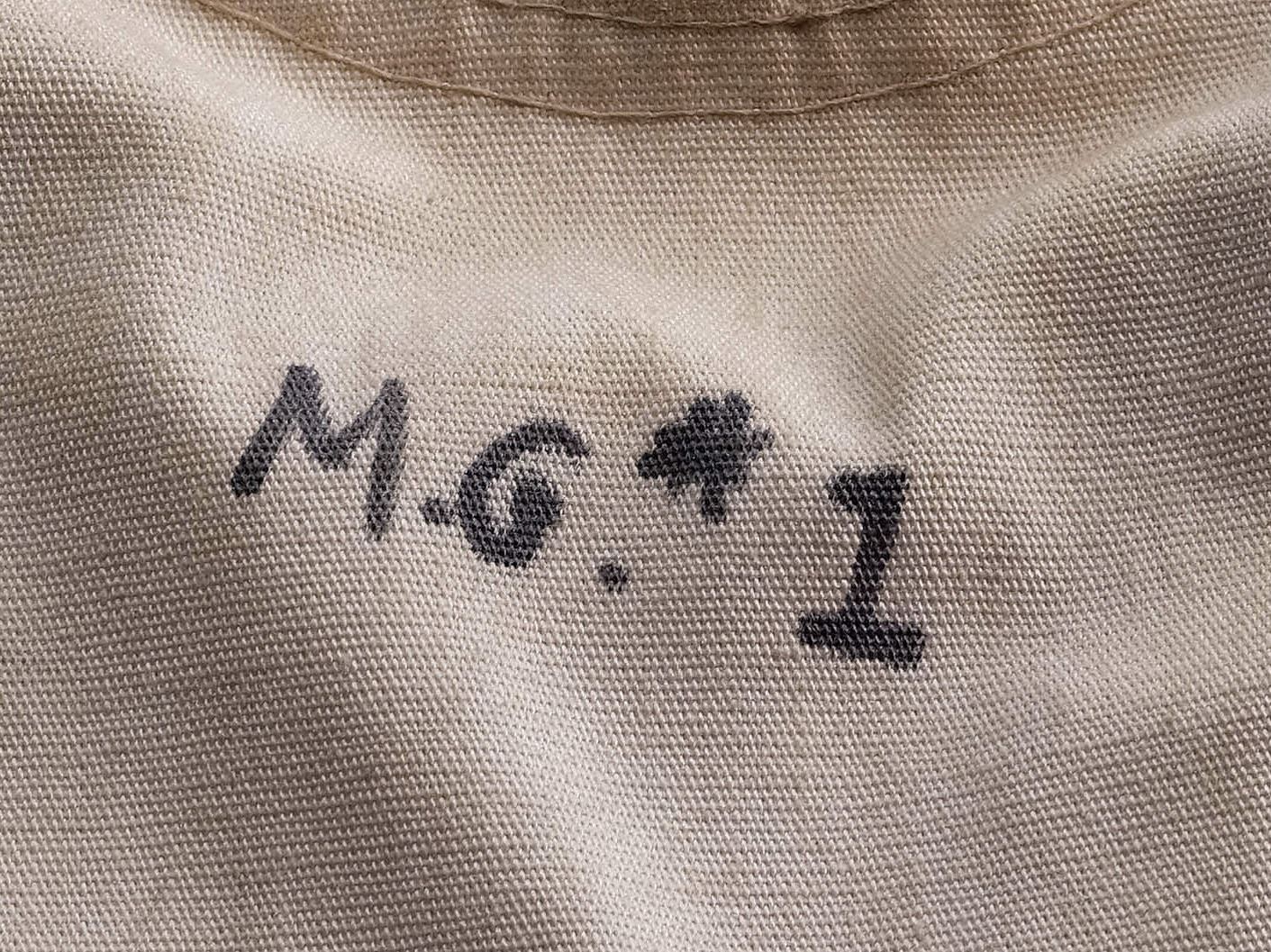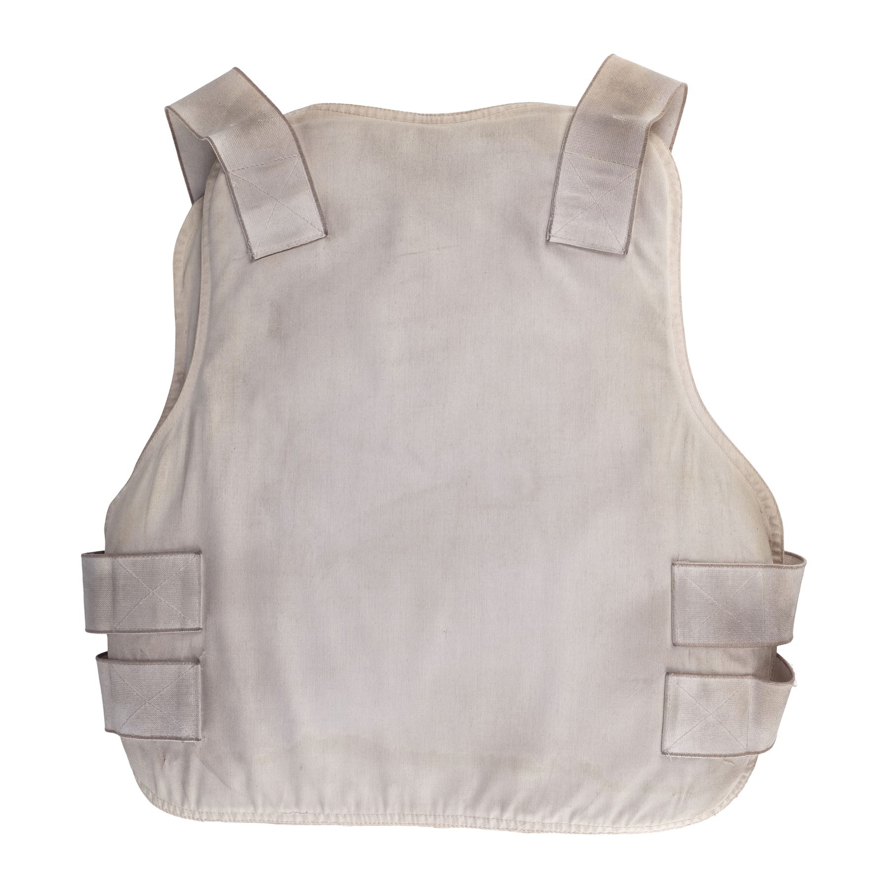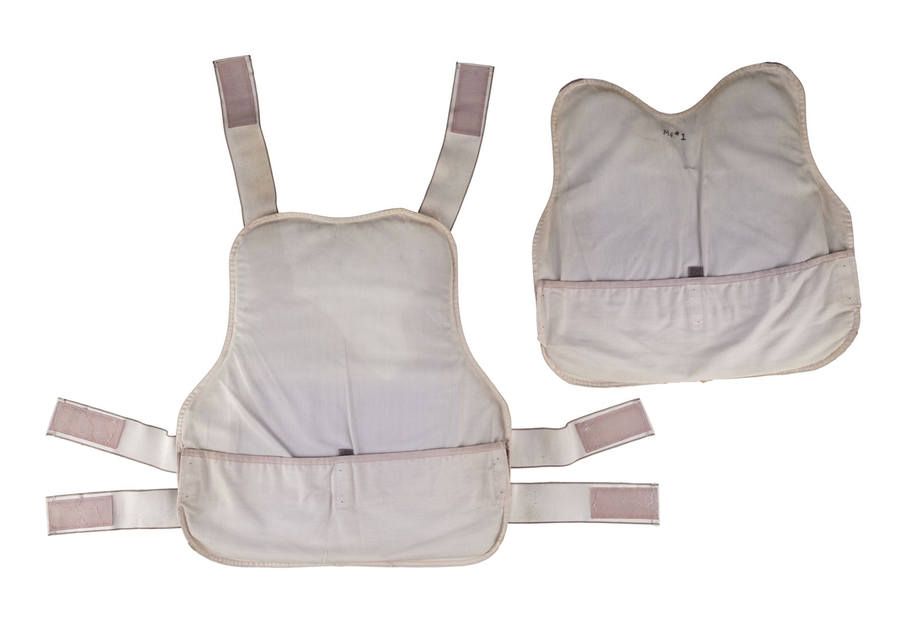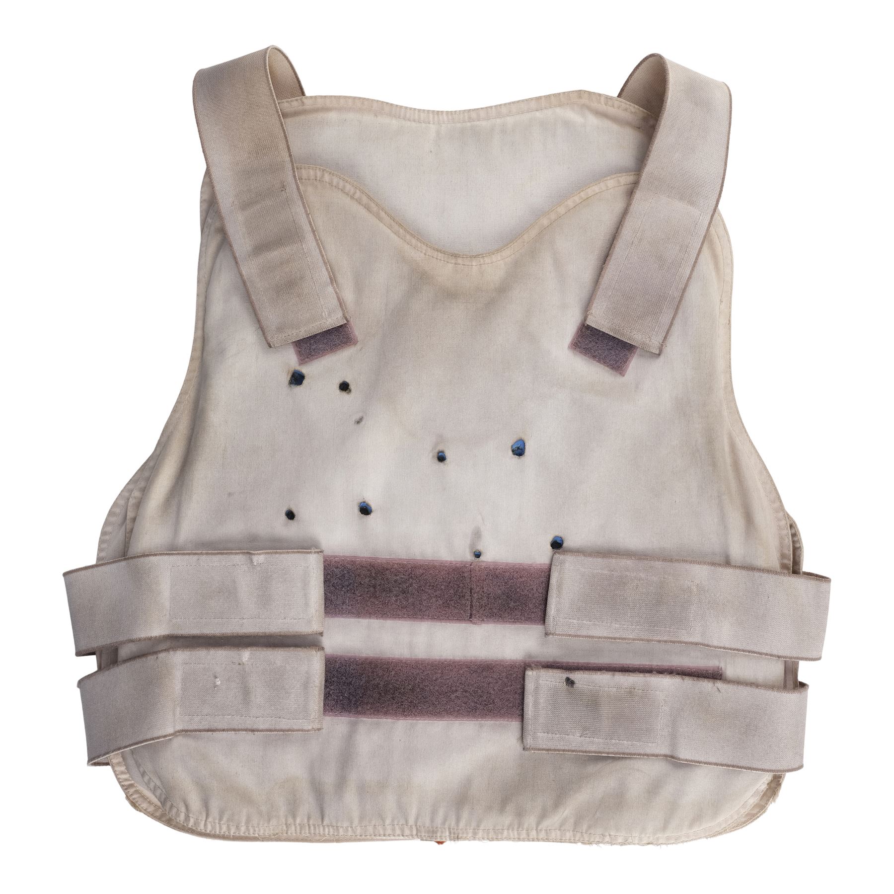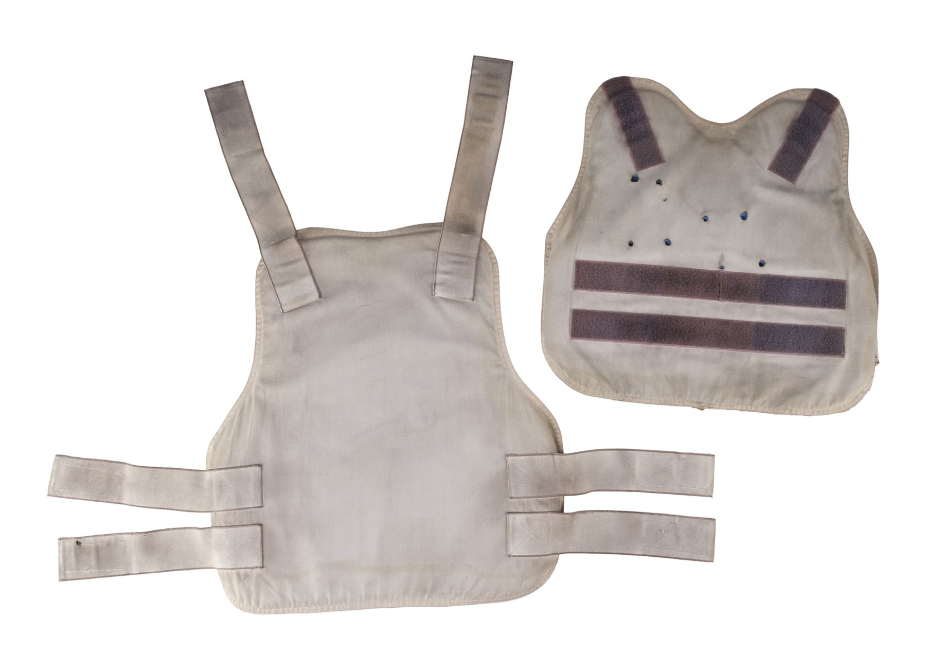 This lot consists of an off-white cotton faux bulletproof vest with blue foam padding and off-white elastic fastening straps on the sides and shoulders. This vest is marked "M.G. #1" and "#1" with internal pockets along the bottom edge and the front covered with bullet holes. This bulletproof vest exhibits grime throughout.